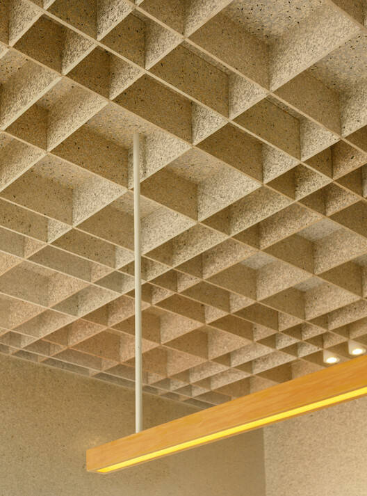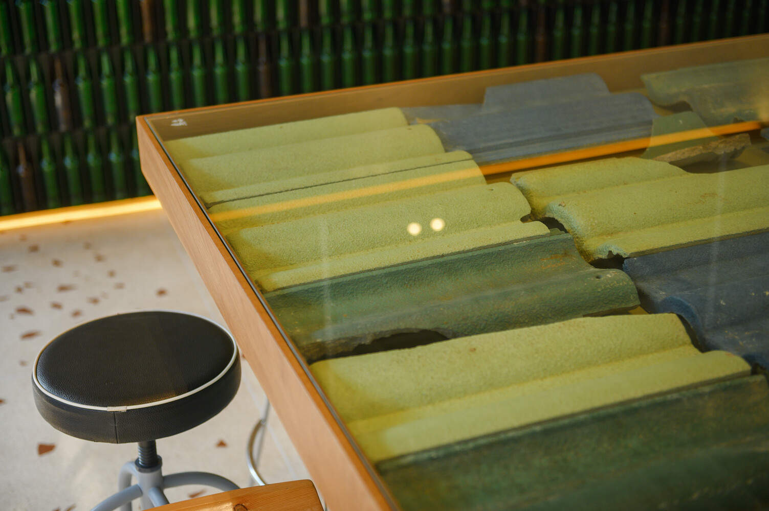 To honor the existing elements that were removed, several elements from the process were selvage and reintroduced as design elements. Reclaimed roof tiles from nearby buildings were incorporated into the counter bar, while outdated floor tiles were repurposed as terrazzo. The floor's white and brown texture is complemented by the grainy texture of shredded milk cartons of the Reboard on the wall cladding and the modular waffle structured ceiling. The earth tone palette gives the cafe a warm and homey vibe which resonates with the wooden window frames and furniture.