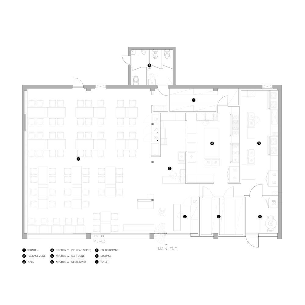 正如我之前所说,Gukbap是一种韩国快餐。一旦你走进餐厅,只需喊出你想要的菜肴数量的清晰度,点餐后食物出来的速度,以及只用勺子就能吃到的简单性,都说明了厨房和用餐区之间和谐的重要性。厨房布局大致分为三个部分:一个用于陈化主猪头的空间,一个用于烹饪陈化肉的空间,以及一个用于在客人上菜前完成准备的空间。由于大厅用餐的趋势是更多地供单人消费,客户希望大厅布局能够容纳单人、双人、四人甚至六人座位。因为整体空间很小,所以桌子的间距很近。在每张桌子的边缘,我们都放置了一张辅助桌子作为隔板,可以放置客人所需的酱汁和配饰。这个空间似乎有许多复杂的划分边界,但通过尽量减少墙壁的数量并解决家具的问题,我们希望从外面看它看起来像一个大空间。