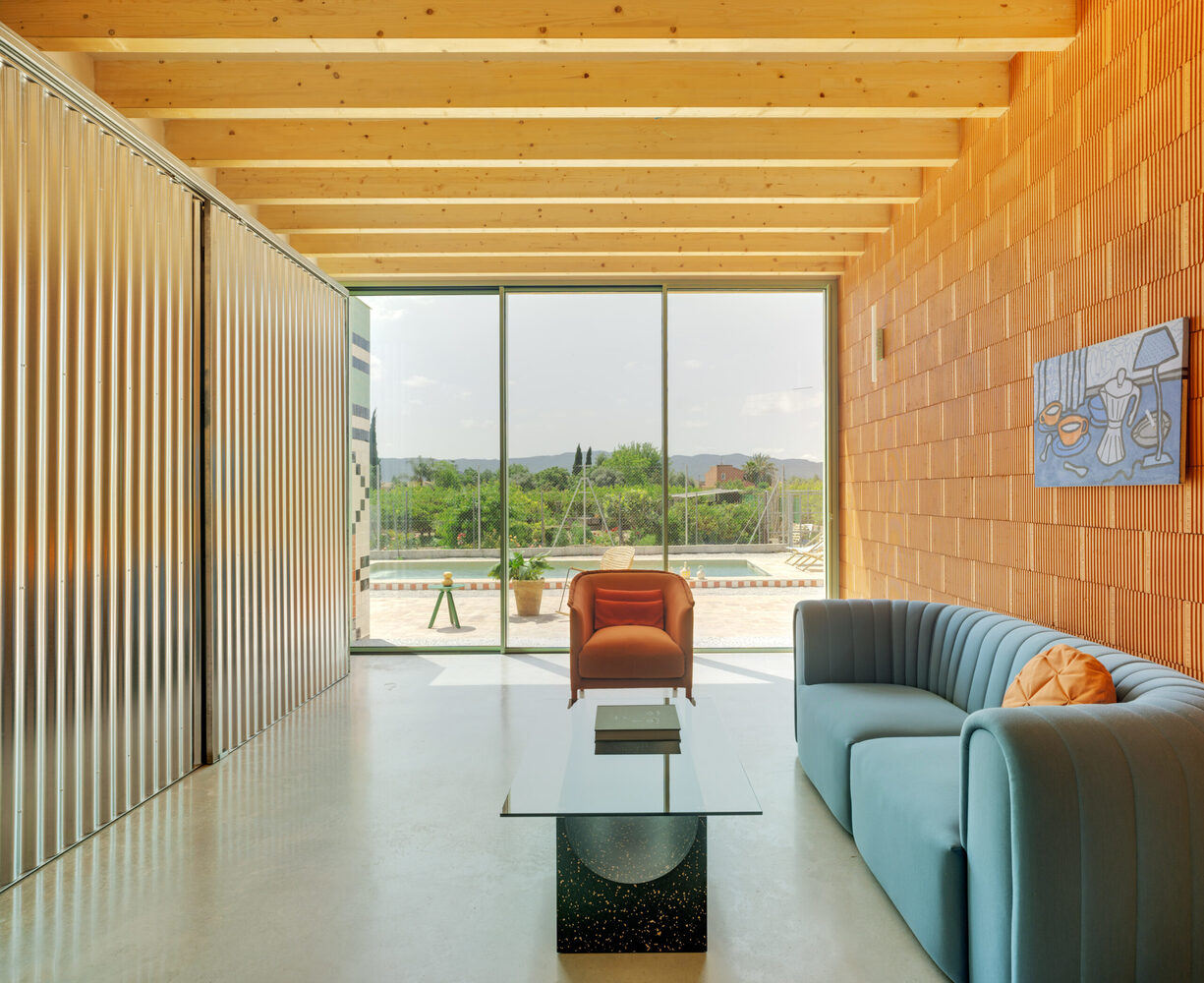项目概念与环境融合:MYM之家最引人注目之处在于其对环境的敏感回应。项目坐落于穆尔西亚果园的独特环境中,建筑师深刻理解了当地的“马赛克”景观特点。设计并非简单地将建筑置于环境中,而是主动融入,与周围的传统房屋、现代建筑、农业设施、蜿蜒小径以及灌溉系统进行对话。这种融合体现在材料的选择和建筑语汇的运用上,例如陶瓷元素、金属板材、芦苇和木材等,这些材料的组合既是对当地传统建筑的致敬,又展现了现代建筑的简洁和创新。整个设计过程更像是一个逐步“组装”的过程,而非一蹴而就的整体规划,体现了对环境的尊重和对细节的关注。