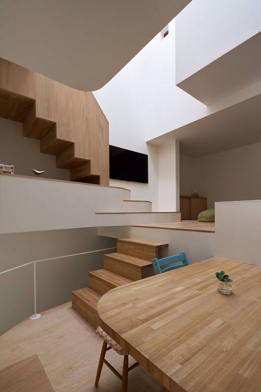 We envisioned the plan as a gradual stacking of natural terrain, which gives a feeling of being outside inside the house. We thought that this outdoor feeling would provide a sense of openness and freedom. To disrupt the feeling of a conventional house, we first set different floor levels and created various places to stay where you feel like sitting on top of a natural terrain.