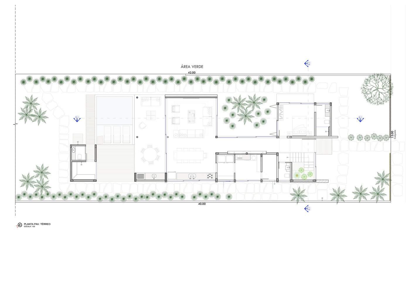 The two-story residence was designed to optimize cross ventilation and natural lighting. One of the biggest challenges was the narrow and elongated terrain, which was overcome by bringing the garden inside the living room, creating a continuous visual connection with the surrounding greenery.