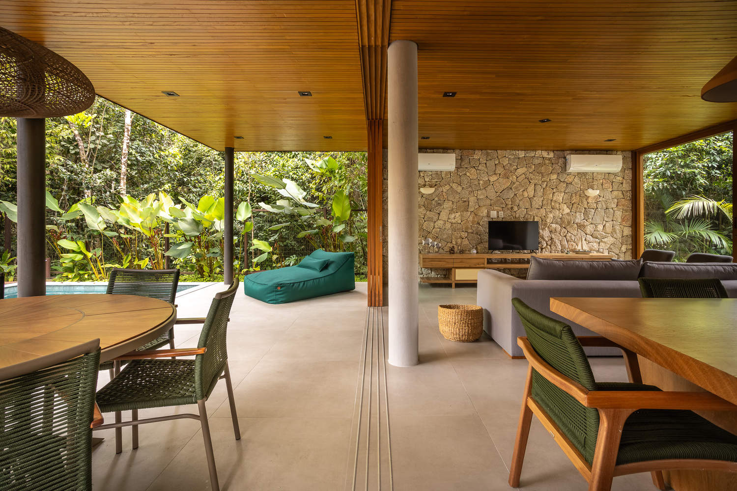 Large eaves were incorporated to ensure thermal comfort, while the outdoor area features a porch, deck, and sauna, creating the perfect environment for relaxation. Additionally, the garden serves as a link to the extensive preserved green area that leads to the river, offering residents the opportunity to paddle to the beach. "The project's proposal was to create fluid spaces where the areas connect organically, while also ensuring that the house has the necessary privacy without losing the connection to the greenery and surroundings," states the architect.