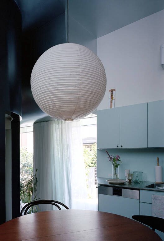 这个黑色圆柱体周围有各种装饰元素,每种元素都有不同的起源。例如,窗户上方面向小巷的银色水平圆柱体既可以作为反射表面,漫射来自高窗和花园景观的光线,也可以作为管道空间。蓝色柱子上的镜子可以让厨房里的人观察客厅。北侧的元素,如厨房和圆柱体,被镜像并转置到内部南墙上,形成绘画形式。