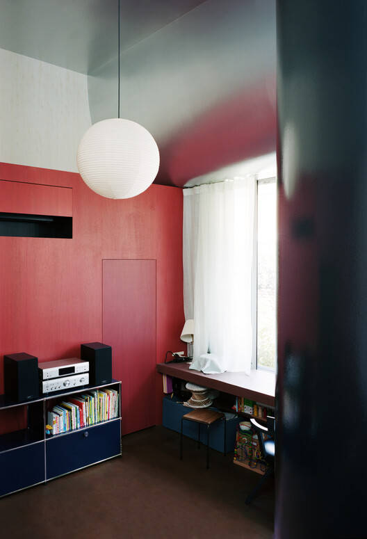 由于黑色圆柱体产生的视觉空白,这个装饰过的空间只被部分感知,随着视角的变化,它会产生一系列无限的碎片图像。同时,在日常生活中,这些形象在脑海中积累,使居民对空间的感知越来越具体,而黑圆柱体逐渐从意识中消失。建筑的象征性在一系列零散的图像背后退去。也许正是在这一点上,圆柱体成为了房子及其居民身份的一部分。正如人们不会有意识地注意到自己的鼻子在他们的视野内一样,居民们也可能有一天会看到这个黑色的圆柱体是透明的。