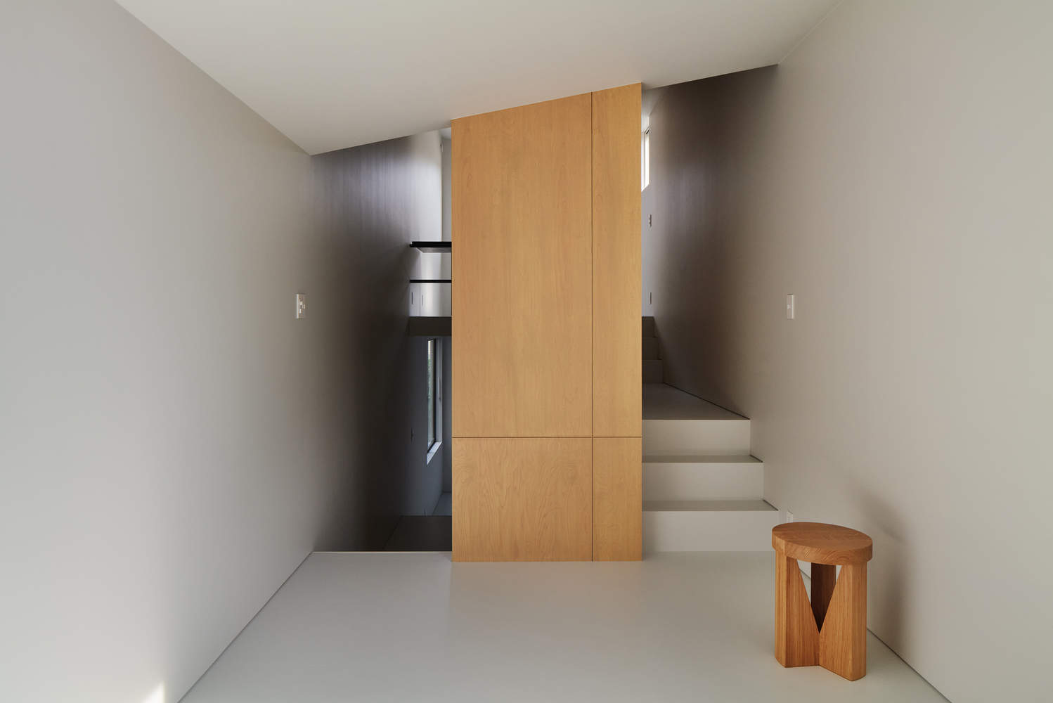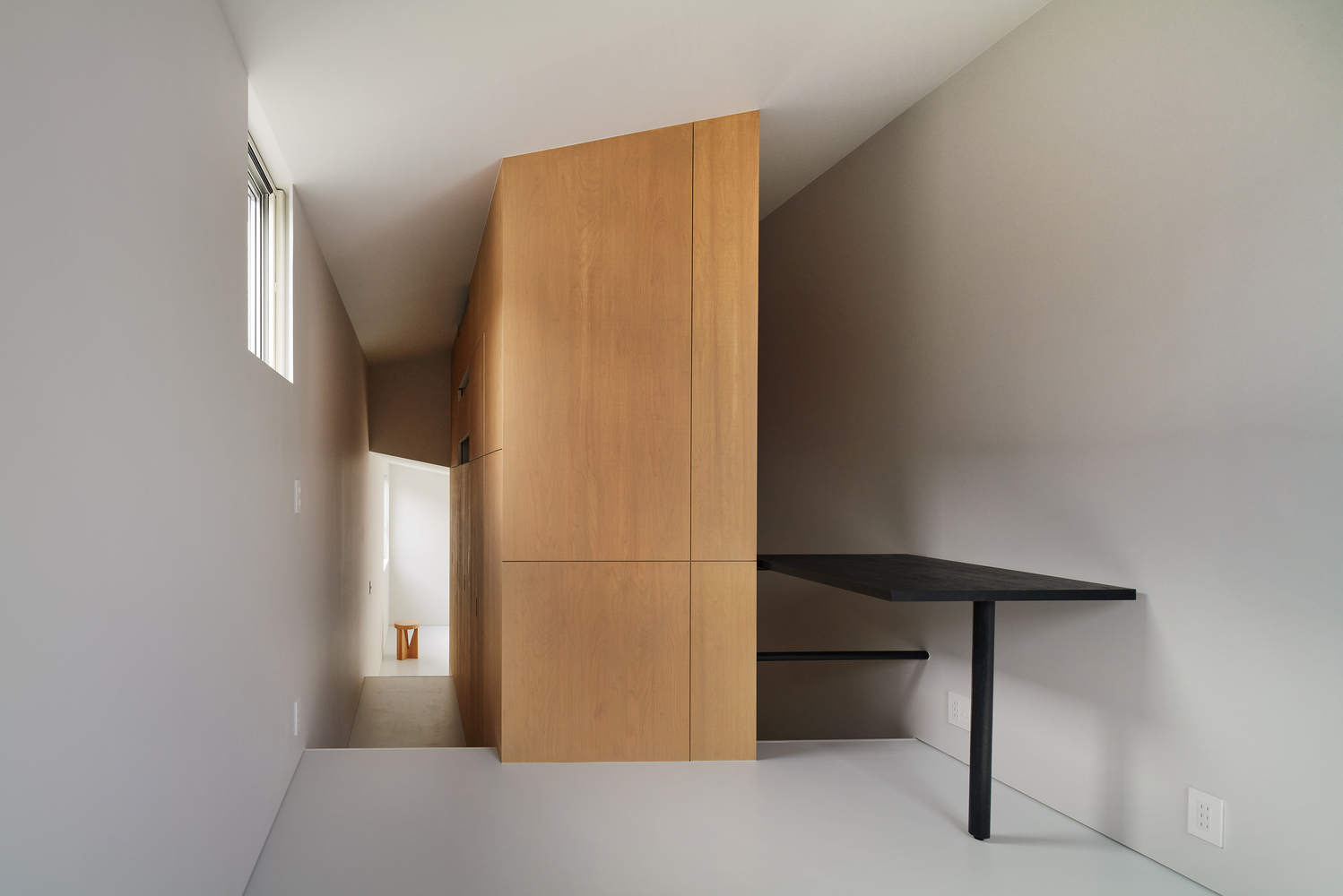 The storage is autonomous, not belonging to any of the rooms, hence the usage of the rooms can be rearranged. The size of the storage is too big for the tiny house, thus confusing the perception of space. It is like a huge chest inside the envelope of a tall single room, while the stretched stairs become reminiscent of an alleyway in a medieval city.