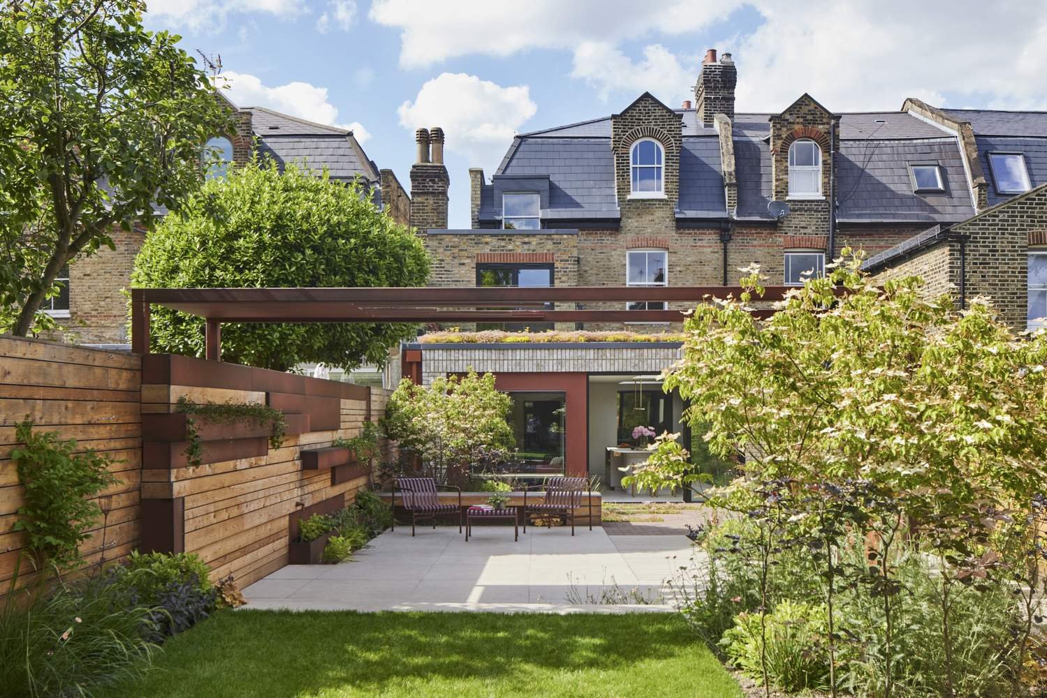 空间改造与光线引入:Russet House 项目最引人注目的亮点在于对原有维多利亚式建筑的巧妙改造。Mulroy 建筑师事务所通过大胆的中庭设计,打破了原有房屋封闭、昏暗的格局。拆除餐厅地板,打通底层与地下室之间的空间,创造出富有戏剧性的垂直感,不仅改善了光线流动,更提升了空间的连通性。同时,设计师巧妙地利用天窗和采光井,将自然光引入室内,使地下室也变得明亮而舒适。这种对空间的重新定义和光线的充分利用,是该项目最核心的成功之处。