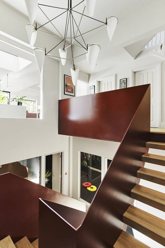 关键的挑战是零散的布局,这是多年零散扩建的结果。Mulroy Architects采取了大胆的干预措施,包括拆除餐厅地板并打开底层和新挖掘的地下室之间的空间,从而建造了一个中央中庭。这种创新的解决方案引入了戏剧性的垂直感,改善了整个家庭的光线流动和连通性。清爽的赤褐色钢楼梯是一个雕塑般的焦点,吸引了人们跨越多个层次的目光。其浓郁的红色色调与墙壁的中性色调形成鲜明对比,以一种意想不到且和谐的方式融合了新旧。楼梯不仅仅是一种流通方式,更是该住宅的一个标志性特征,体现了该项目的同名名称。