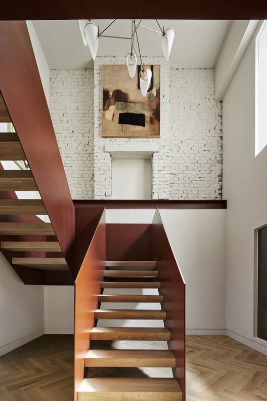材质与色彩的和谐统一:该项目在材料和色彩的选择上展现了极高的审美水平。设计师选择了温暖的赤褐色、橙色、棕色和粉色等大地色系,与中性的灰色和白色形成对比,营造出温馨而吸引人的氛围。裸露的砖墙和光滑的灰泥 textures 的对比,以及金色拼花地板的运用,都增强了空间的层次感和质感。而标志性的赤褐色钢楼梯,更是项目的视觉焦点,其色彩与整体设计风格相呼应,将新与旧完美融合,突出了项目的独特性,体现了设计师对细节的极致追求。