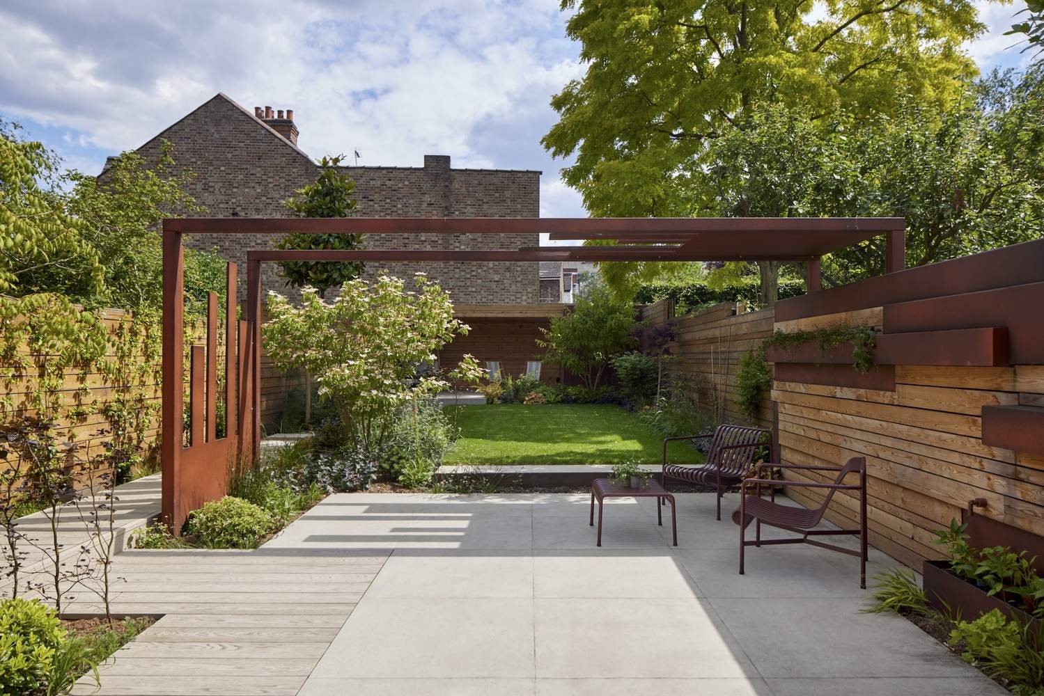 Materiality plays a crucial role in creating a warm, inviting atmosphere. Earthy tones, from russet reds to deep oranges, browns, and pinks, are balanced against cooler greys and whites. Exposed brick and smooth plaster add texture, while golden-hued parquet flooring unifies the different levels. The integration of greenery, both inside and in the landscaped garden, reinforces a seamless indoor-outdoor connection.