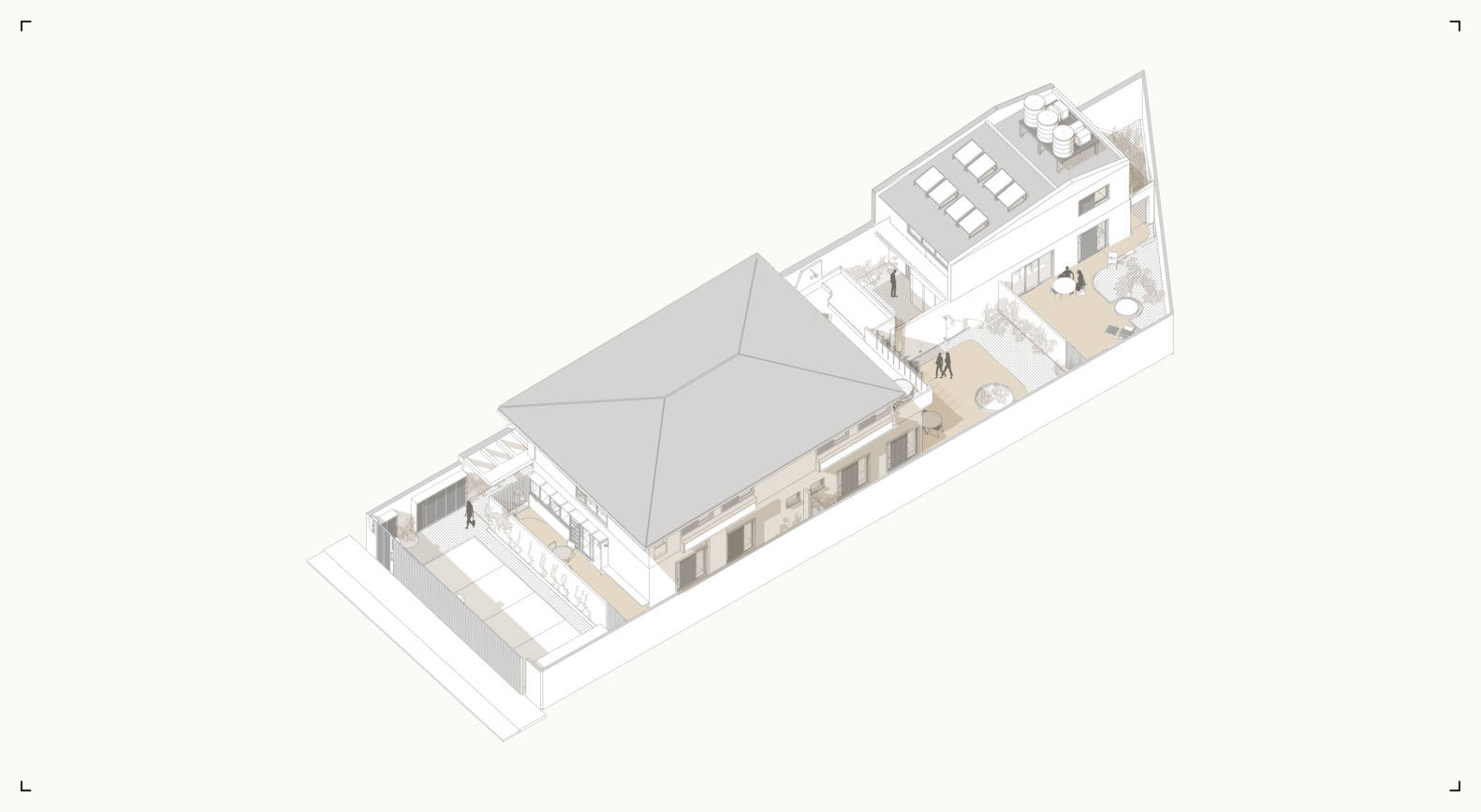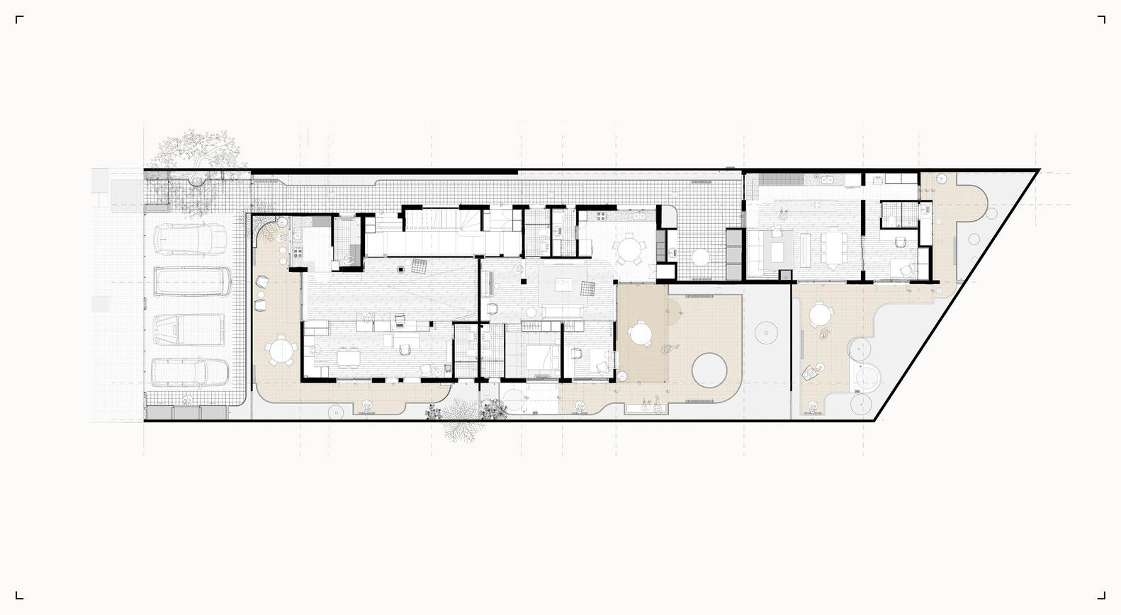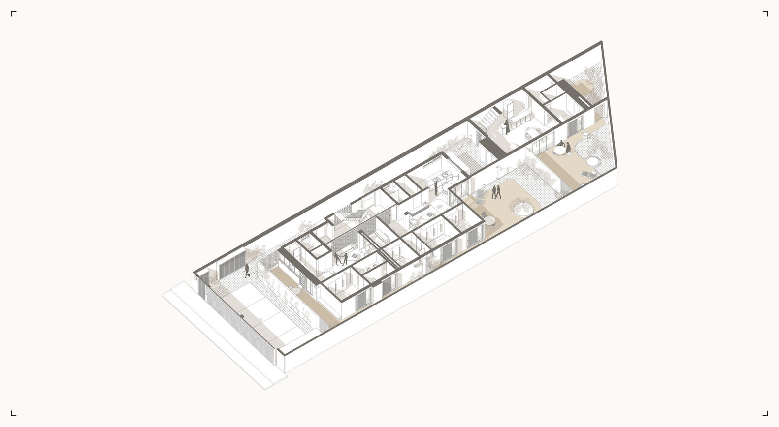 该提案旨在创建一个住宅村,其公共区域包括流通空间、花园、汽车和自行车车库,以及所有单元的私人花园和露台。改造重新定义了原始房屋,在不大幅改变建筑面积的情况下使其适应新的需求,反映了当前城市对修改其用途和密度的需求,而不一定需要建造新建筑。