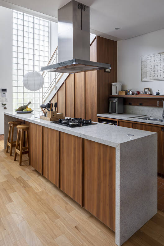 改造与更新的智慧: 该项目最令人印象深刻的亮点在于其对现有建筑的巧妙改造与更新。设计团队没有选择推倒重建,而是将一座450平方米的住宅改造成五个独立的住宅单元,这体现了对可持续发展理念的深刻理解。项目尊重原有建筑的结构和美学,保留了石墙、玻璃砖和粘土瓦屋顶等特色元素,并通过新建部分与原有建筑的对话,实现了新旧之间的和谐统一。这种策略不仅减少了资源浪费,也赋予了原有建筑新的生命力,使其适应了现代城市对居住空间多样化的需求,展现了建筑师对城市文脉和环境的尊重。
