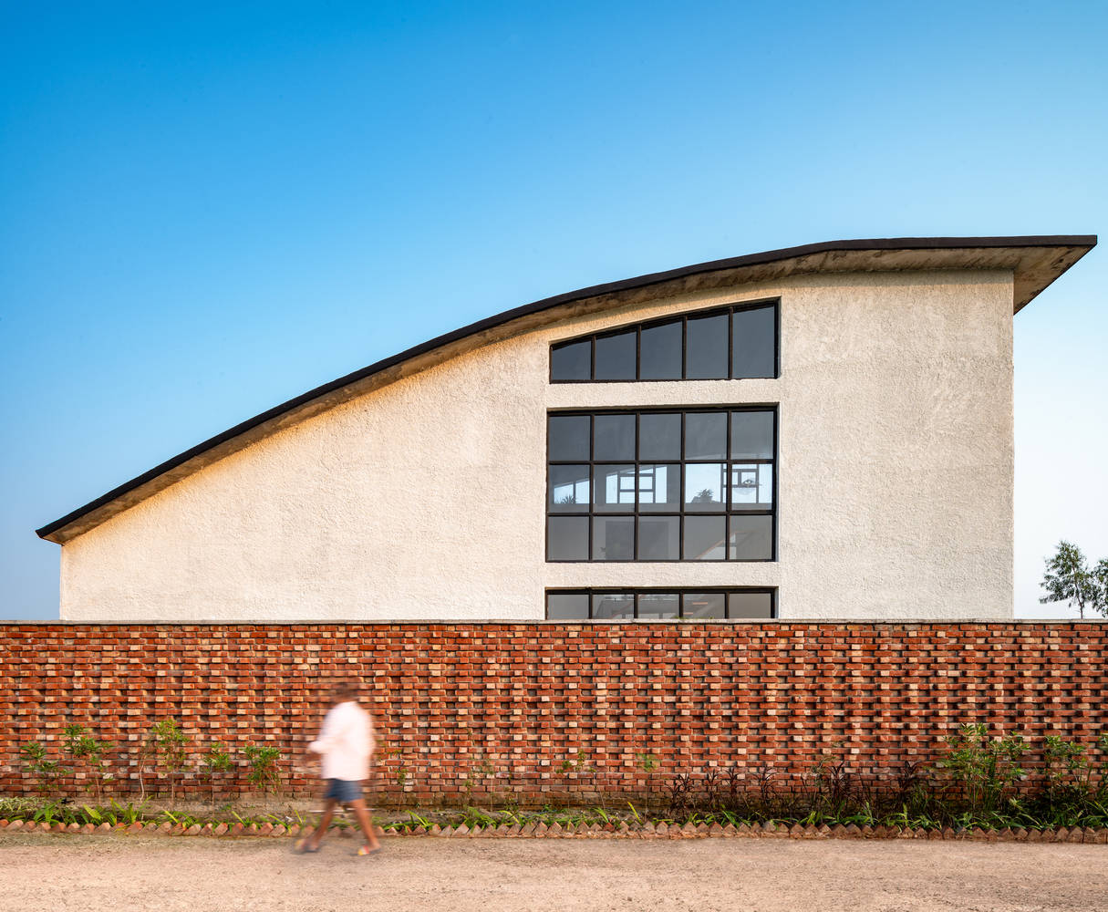 Environmental stewardship is integral to the design. A comprehensive rainwater management system—including chain drips and a deep recharge pit—returns excess water to the ground, ensuring the house actively nurtures the ecosystem it inhabits. The building's siting and material choices reduce embodied energy, while the openness of the structure encourages natural ventilation and daylighting. A distinctive parametric brick boundary wraps around the home like a woven skin—its rhythm of curves and arches invites exploration, acting as both filter and frame for the landscape beyond. From a distance, a singular curve hints at the spatial drama within.
