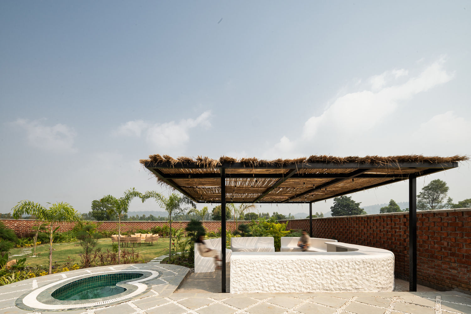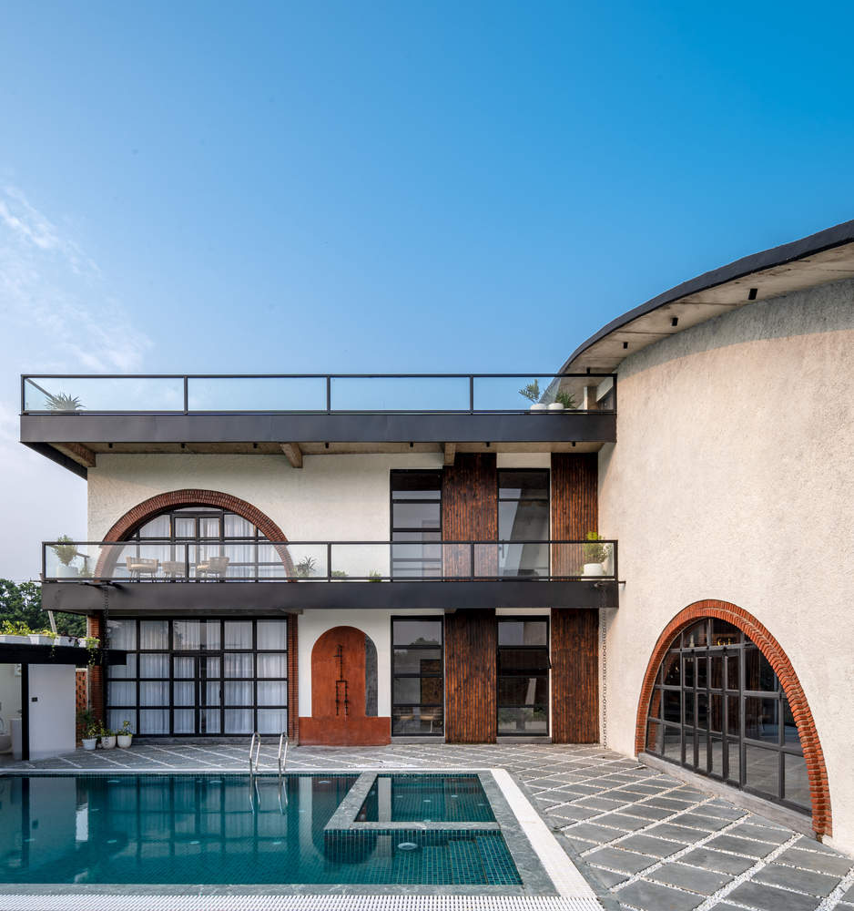 Designed for Gaurav Tinjni, Amit Madan & Mohit Khurana the design pays homage to timeless forms and vernacular sensibilities. Exposed brick and sweeping arches define the spatial rhythm, creating a tactile, grounded experience. Reflected in the still waters of the pool, the arches form near-perfect circles—symbols of continuity and timelessness. These elements evoke both strength and serenity, offering a space that is as meditative as it is architectural. The material palette is both minimal and meaningful. Textured brickwork, satin-polished concrete floors, and bamboo accents speak of restraint and elegance. Funicular shells hang gracefully, capturing play of light and shadow like frozen waves, while exposed concrete filler slabs offer a subtle nod to the local craft heritage.