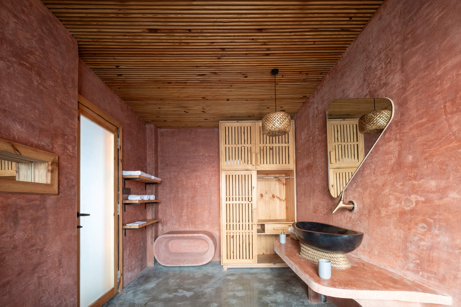 材料运用与空间营造:项目在材料的选择上独具匠心,裸露的砖块、弧形拱门、缎面抛光的混凝土地板和竹制装饰,共同构建出一个富有触感且质朴的空间体验。拱形结构在平静水面的倒影形成近乎完美的圆形,象征着连续性和永恒。材料的运用不仅注重美观,更强调其背后的意义,例如暴露的混凝土填充板是对当地工艺的致敬。室内设计则秉承极简主义原则,通过天然材料、简洁线条和温暖色调营造出亲密而反思的氛围。特别是浴室,采用无缝彩色混凝土装饰,与周围景观的纹理相呼应,突出了人与自然的和谐统一。