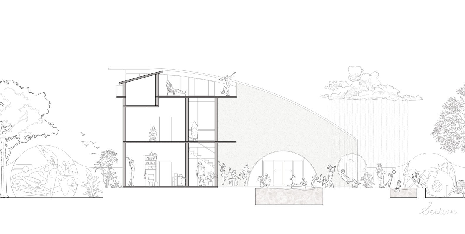 环境管理是设计不可或缺的一部分。一个全面的雨水管理系统——包括链式滴水和一个深的补给坑——将多余的水送回地面,确保房屋积极培育其居住的生态系统。建筑的选址和材料选择减少了隐含能量,而结构的开放性则促进了自然通风和采光。一个独特的参数化砖边界像编织的皮肤一样环绕着房子——它的曲线和拱门的节奏吸引了人们的探索,既作为过滤器,又作为外部景观的框架。从远处看,一条奇特的曲线暗示着内在的空间戏剧。