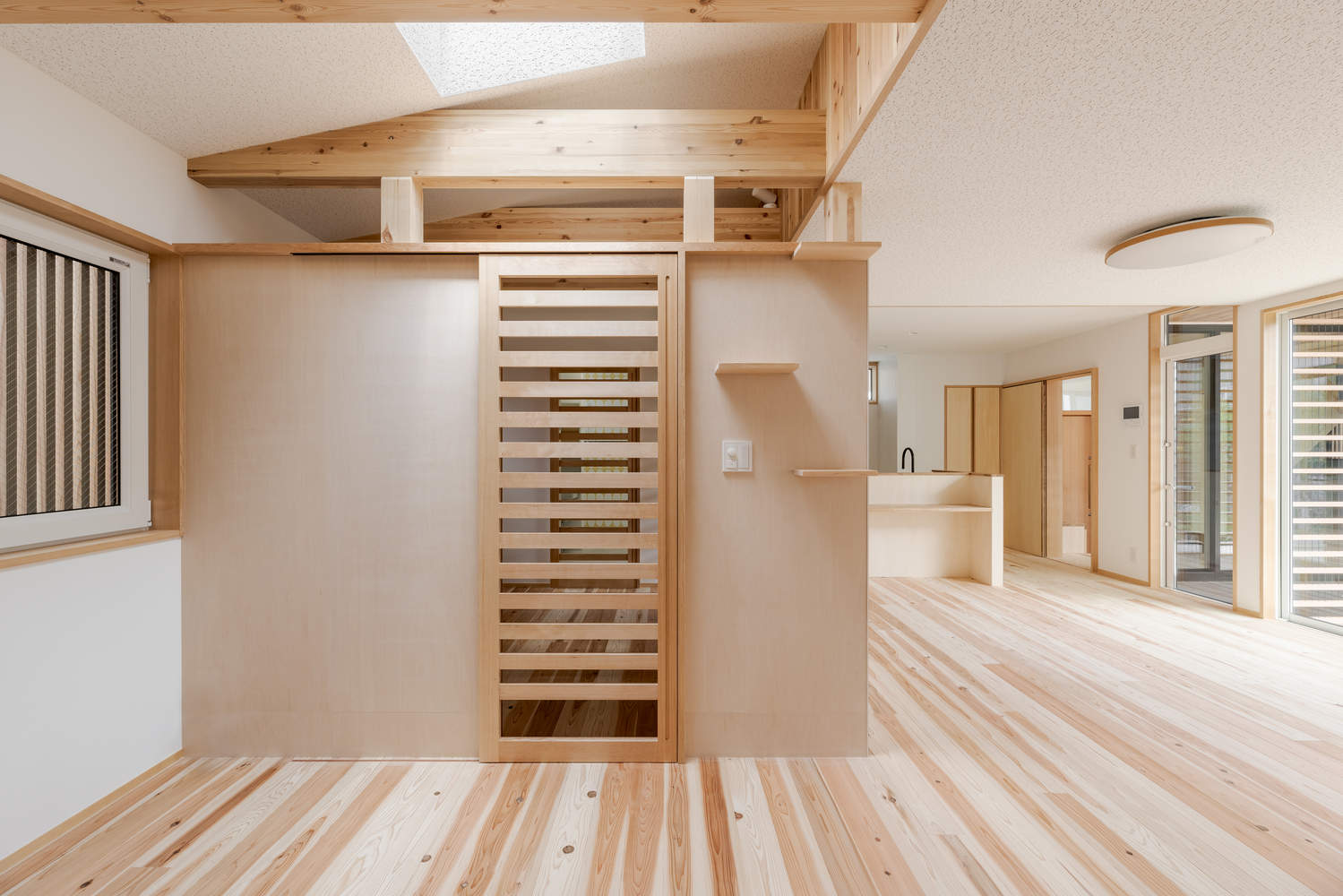 Large openings facing the garden and balcony, combined with carefully positioned skylights, invite plenty of natural light into the home. The attic is designed as an open storage space with exposed beams, creating a fun area for the cats to roam freely and allowing fresh air to flow to all levels. At the back of the entrance, we created a covered terrace overlooking the yard, featuring louvers that soften the light and provide a safe space for the cats to enjoy the outside air.