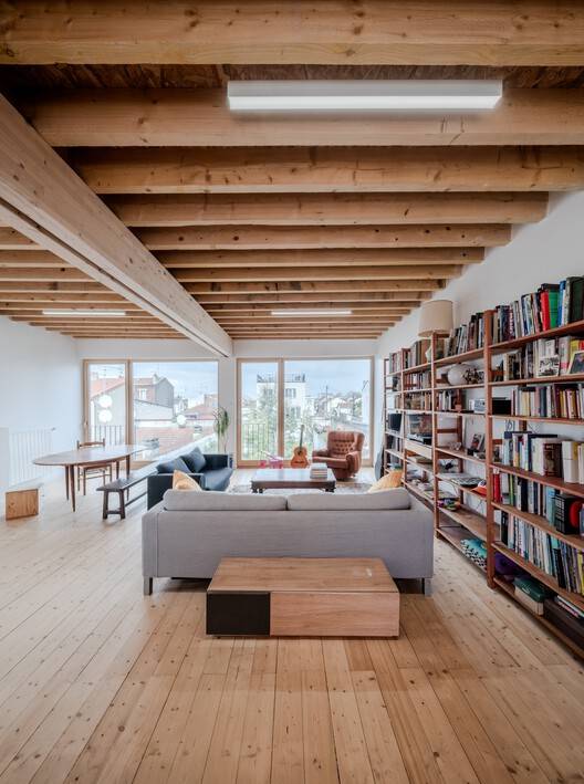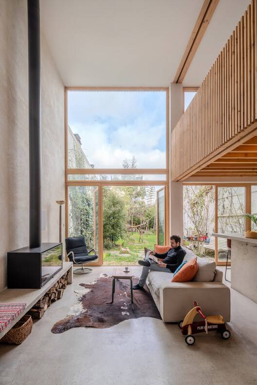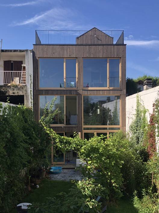 Behind a discrete street façade, the house opens up into a spacious three-story volume, entirely rebuilt with a timber frame structure anchored to the existing masonry. The wooden façade on the garden side creates a strong dialogue with the lush exterior and reveals the house's structural clarity. Inside, two open-plan levels offer full visual continuity from the street to the garden, emphasizing transparency, spatial contrast, and material sincerity.