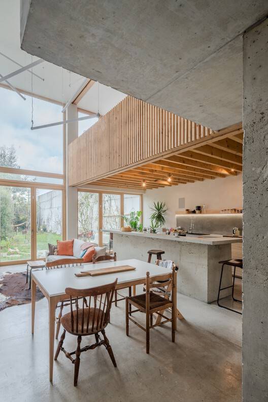 The interplay between wood and raw concrete structures the domestic experience. Daylight flows through large-scale windows, animating a sequence of volumes that blur the boundaries between interior and exterior. The architectural language avoids formal gestures, favoring a calm articulation of material, light, and function.