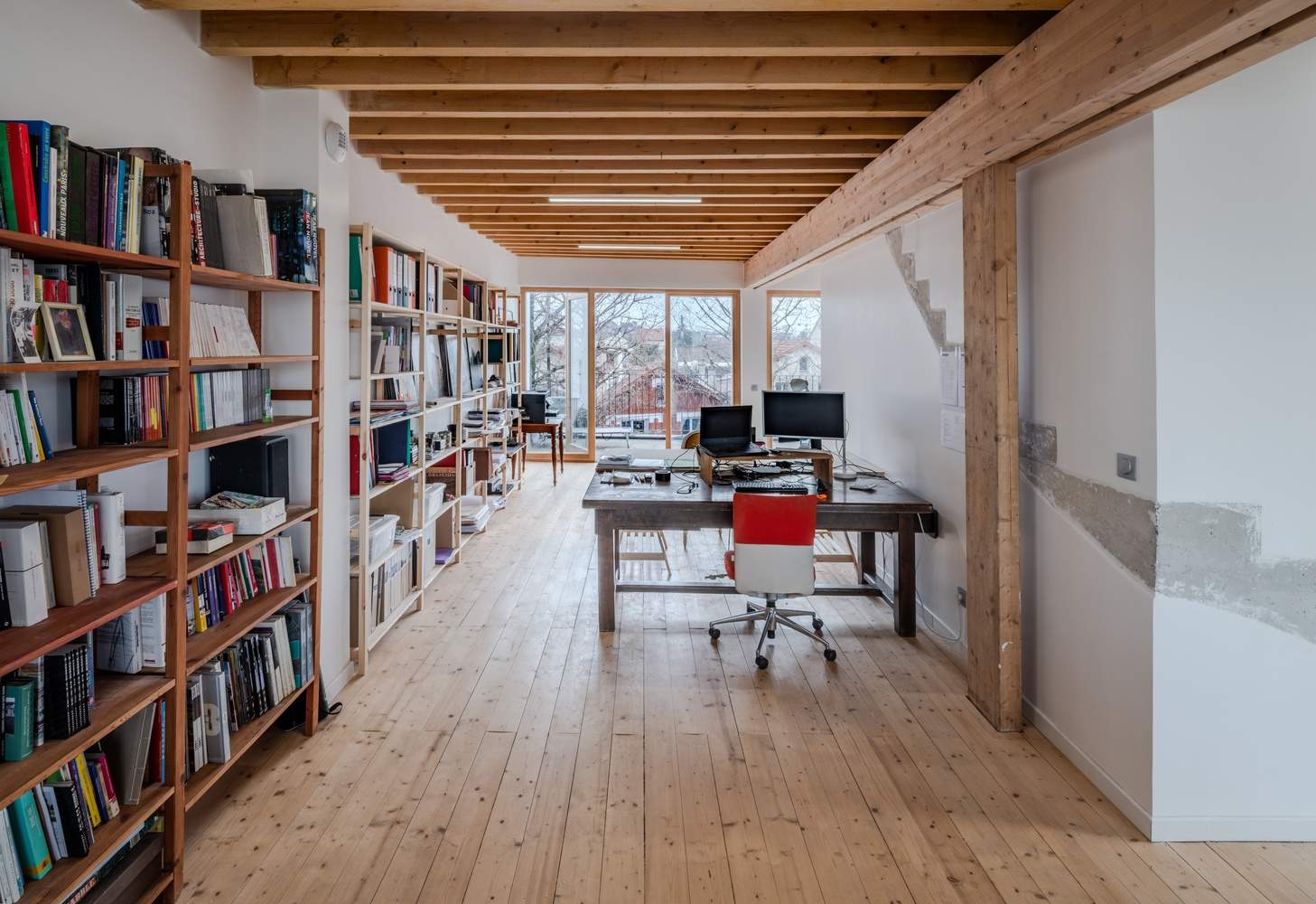 材料的对话与空间的流动性: 建筑设计中对木材和混凝土的巧妙运用,是项目的一大亮点。木材的温暖质感与混凝土的原始质感形成了鲜明的对比,营造出丰富的视觉层次和触觉体验。特别是花园一侧的木立面,与郁郁葱葱的外部环境形成对话,突出了建筑的结构清晰度。在室内空间的设计上,开放式的平面布局强调了从街道到花园的视觉连续性,模糊了室内外的界限,使光线能够自由流动,创造出通透、开阔的空间感受,体现了设计对空间流动性和材料真实性的追求。