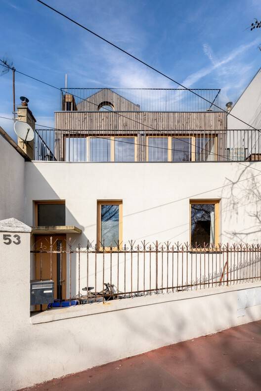 Text description provided by the architects. This project transforms a modest 1930s suburban house into a generous and light-filled dwelling. Located in a narrow plot within a discontinuous urban fabric, the new structure reinterprets the typology of the detached pavilion, extending vertically while preserving the urban scale and rhythm of the street.