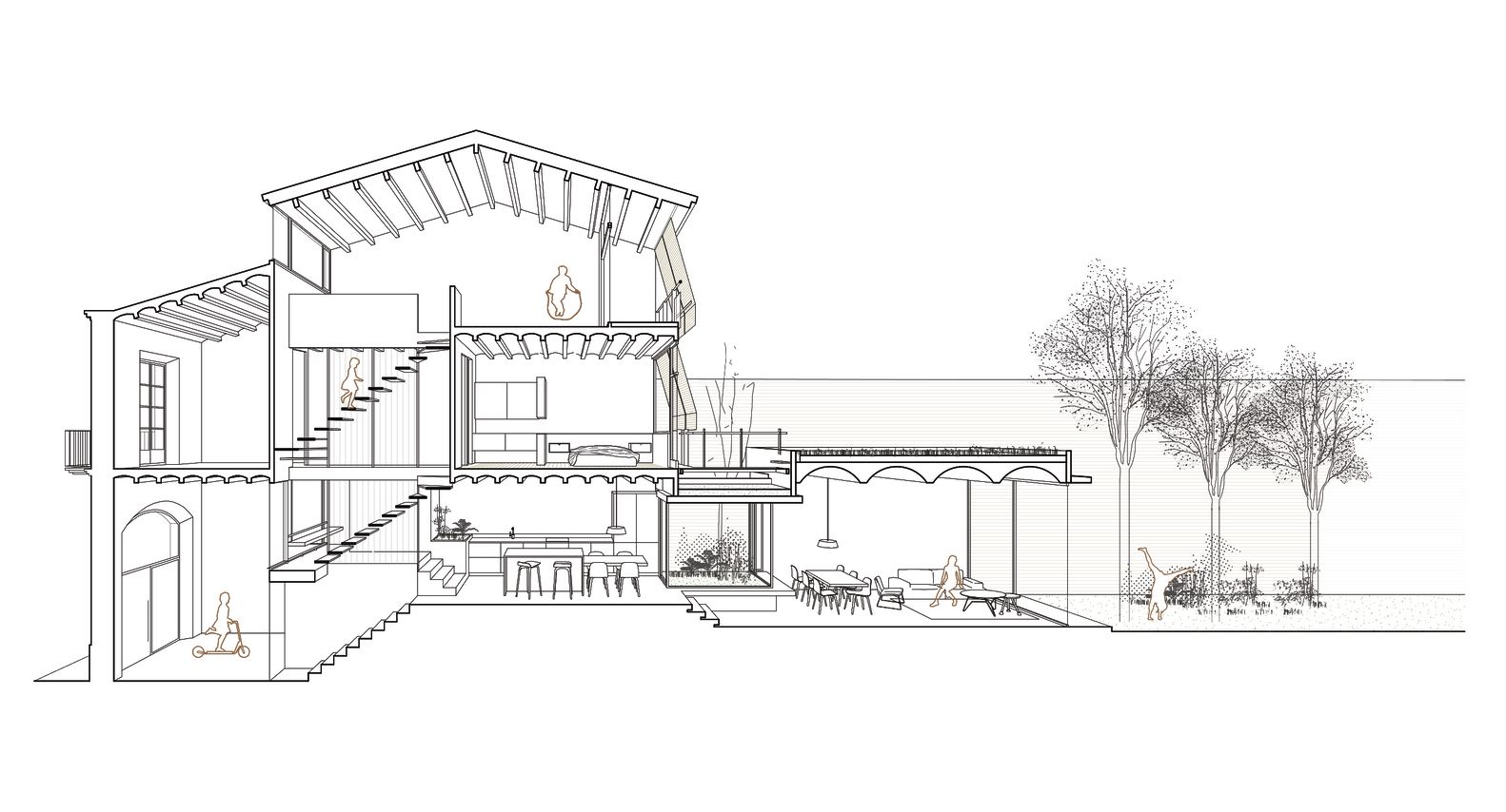 The heights of the existing floors are very low, and the level of the backyard garden is situated between the floors, which compels us to design the new home with a sectional approach where each room is placed at a specific height. The different platforms define the program. The house is experienced as a succession of spaces that transition from less to more private, intertwined through both horizontal and vertical pathways.