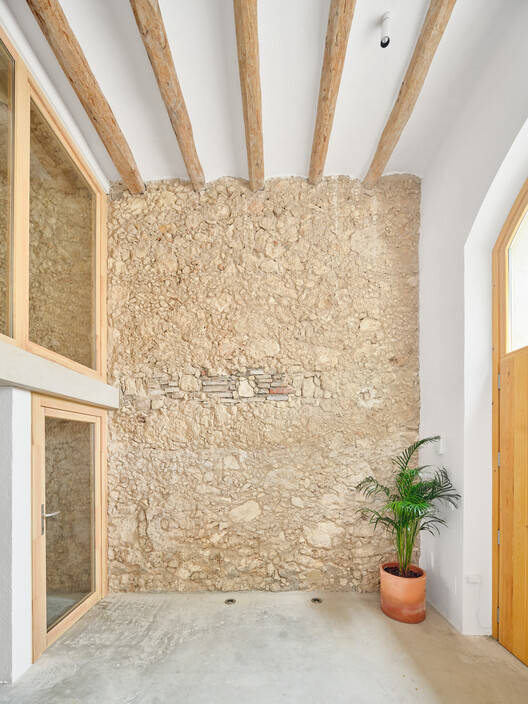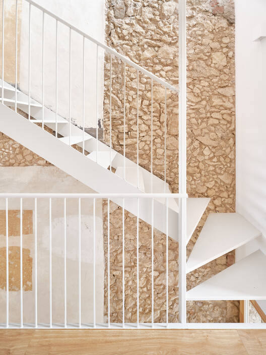 Text description provided by the architects. This is a plot between party walls, 3.5 meters wide and 35 meters long, with a buildable depth of 22 meters, a generous depth that becomes an opportunity for the project. From the existing construction, which consists of a ground floor, mezzanine, first floor, and attic, we retain only the street facade, some strategic slabs, and the load-bearing party walls. We dismantle and restore the elements we keep to highlight the quality and texture of their materials, which will help give identity to the home.