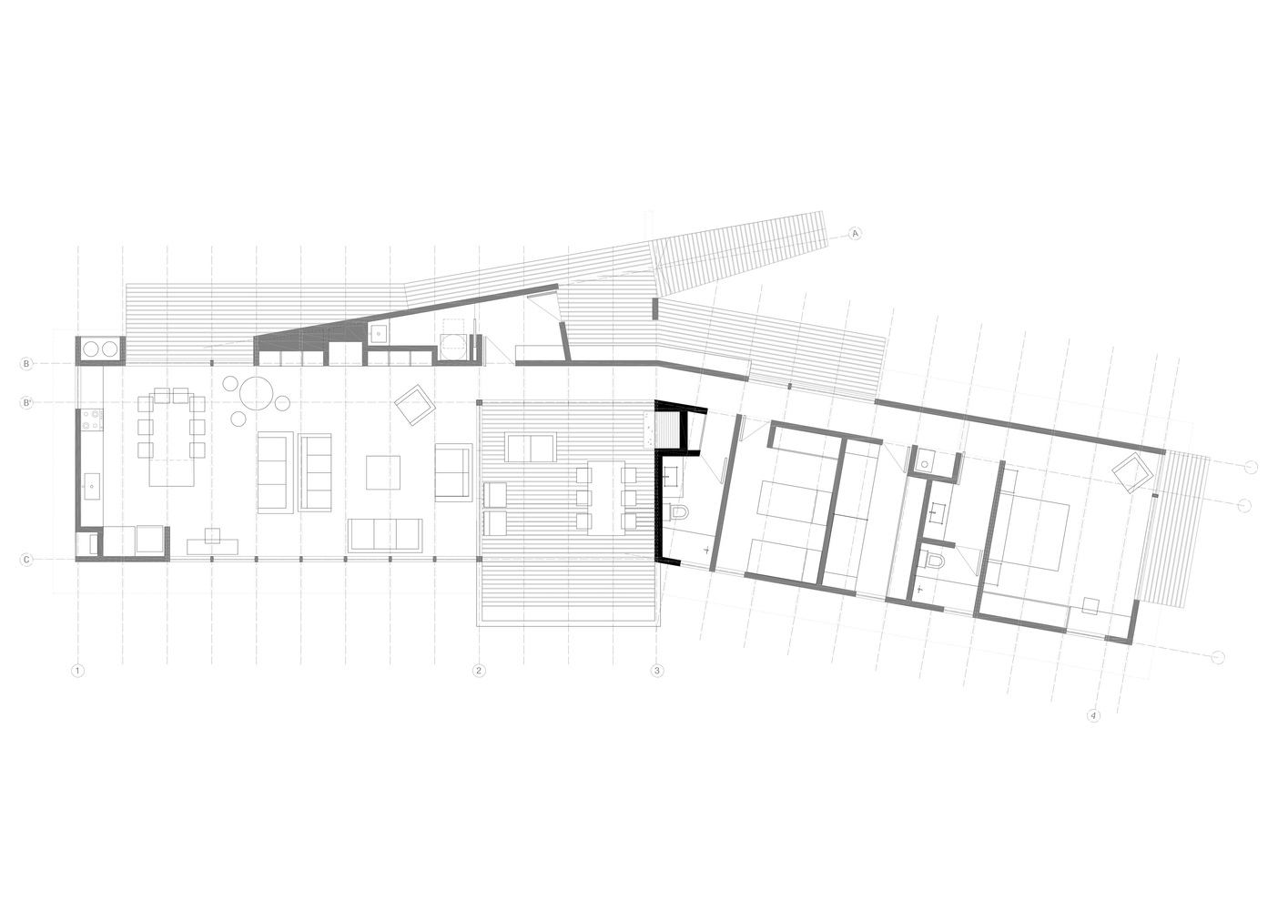 该项目由一个有盖的露台组成,露台将生活空间与卧室隔开,同时通往一个俯瞰河口和山景的小空地。这座房子还承认它的两个正面,从屋顶向北上升,为房间捕捉阳光,向南下降,位于湖面之上。