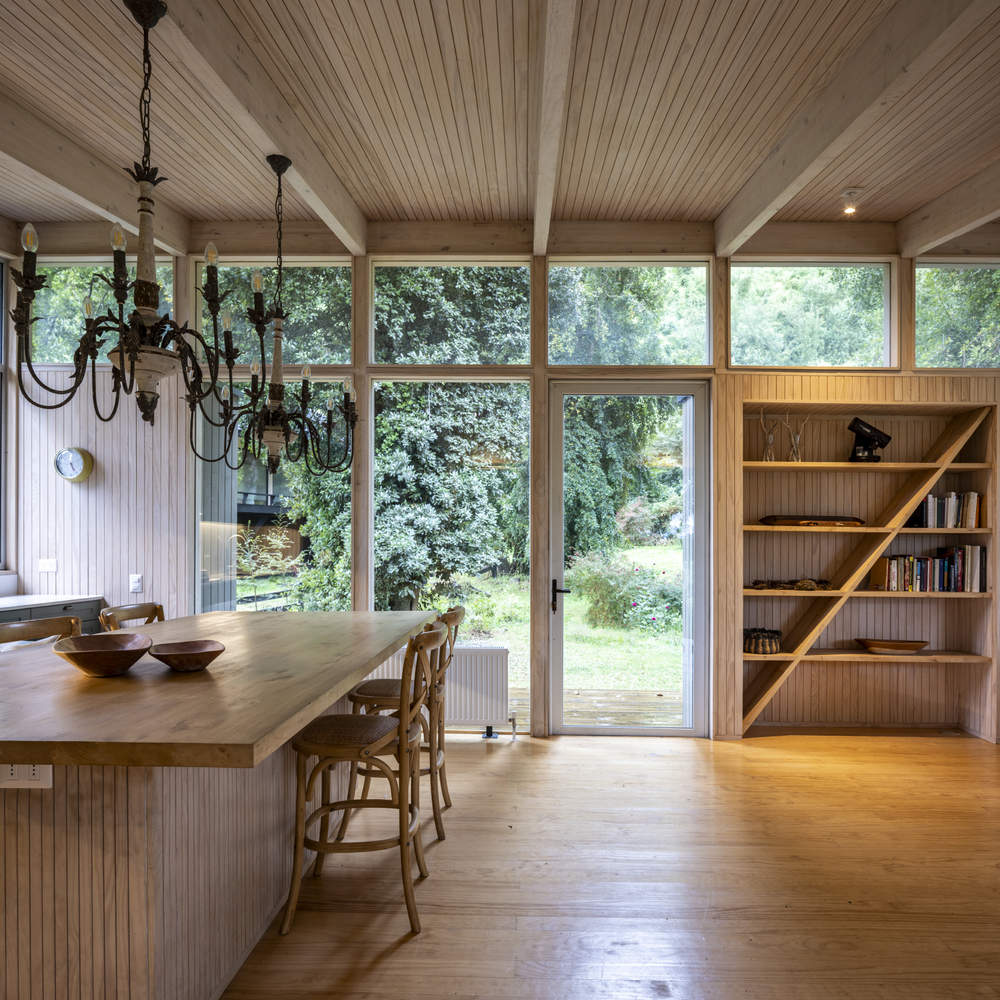 This is how the house is spread out longitudinally along the southern edge of the land, contrasting its horizontality with the height of the forest and relating each of the interior spaces to their view of the lake.