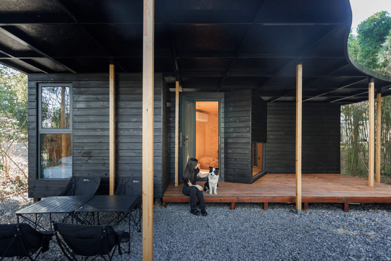 In addition to the green palette-shaped roof, the entire cabin is wrapped in black carbonized wood. The wooden structure space supporting the roof is also part of the space. The supporting structure is a 10cmx10cm wooden structure randomly distributed around the cabin. We hope that the cabin will present a contrast between the inside and the outside. From the sky, it looks like an abstract and flamboyant design with artistic tendencies. But when you walk into it, you will feel the real and rustic texture, real wood, black carbonized facades, and indoor and outdoor spaces where you can roam barefoot, which is fully integrated with nature.