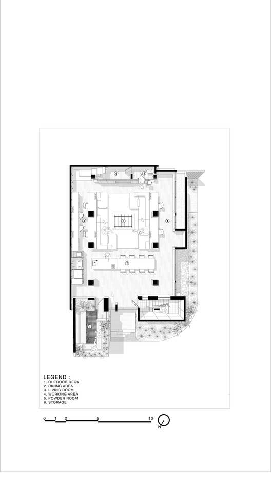 The open layout design eliminates barriers, removing walls and corridors within the space. By optimizing the existing structure, the design ensures that all floors above ground are open plans, minimizing walls or heavy elements that could disrupt the flow. This approach creates a series of alternating spaces characterized by intimacy and openness, light and shadow, offering room for growth and moments of variation through the strategic arrangement of furniture across the space, which interacts harmoniously with the existing structure and nature.