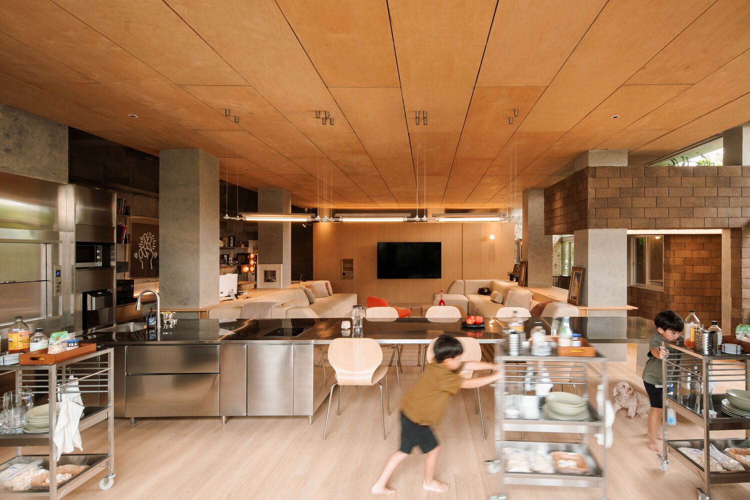 开放式布局设计消除了障碍,消除了空间内的墙壁和走廊。通过优化现有结构,该设计确保了地面上的所有楼层都是开放式的,最大限度地减少了可能扰乱流动的墙壁或重物。这种方法创造了一系列以亲密和开放、光影为特征的交替空间,通过在整个空间中战略性地布置家具,为成长和变化时刻提供了空间,与现有的结构和自然和谐互动。