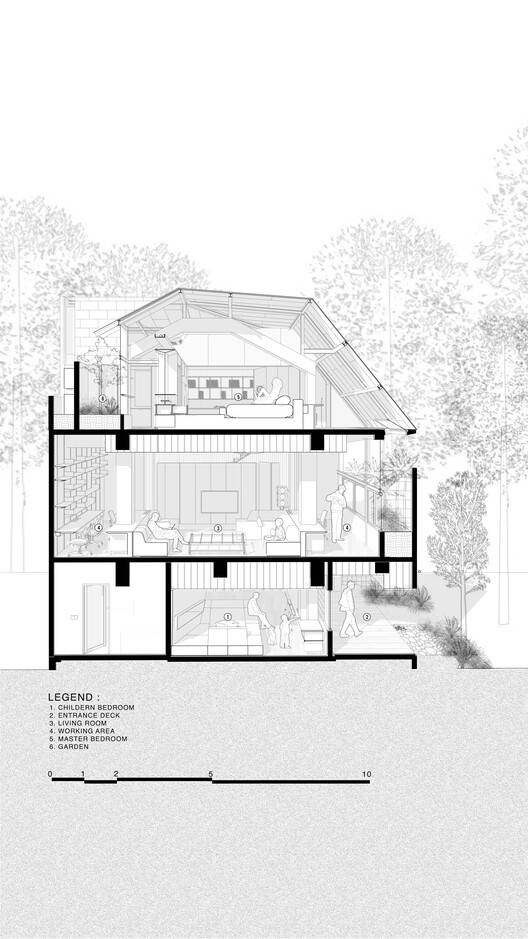 The arrangement of semi-geometry within the design, alongside the existing wooden elements, fosters an ambiguous and fluid space suited for essential residential functions. By working with the existing framework—determining what is sufficient and what may be excessive or insufficient—the spaces become difficult to define precisely, blurring lines and boundaries to create a more fluid functionality while the interior will be enhanced by movable elements added over time by the homeowners. This renovated house is designed for an architect couple who sought both the privacy of a home and abundant openings for natural light, along with a VIP view of the greenery.