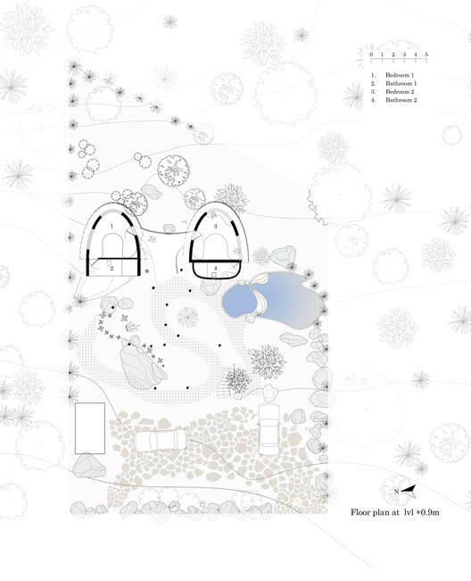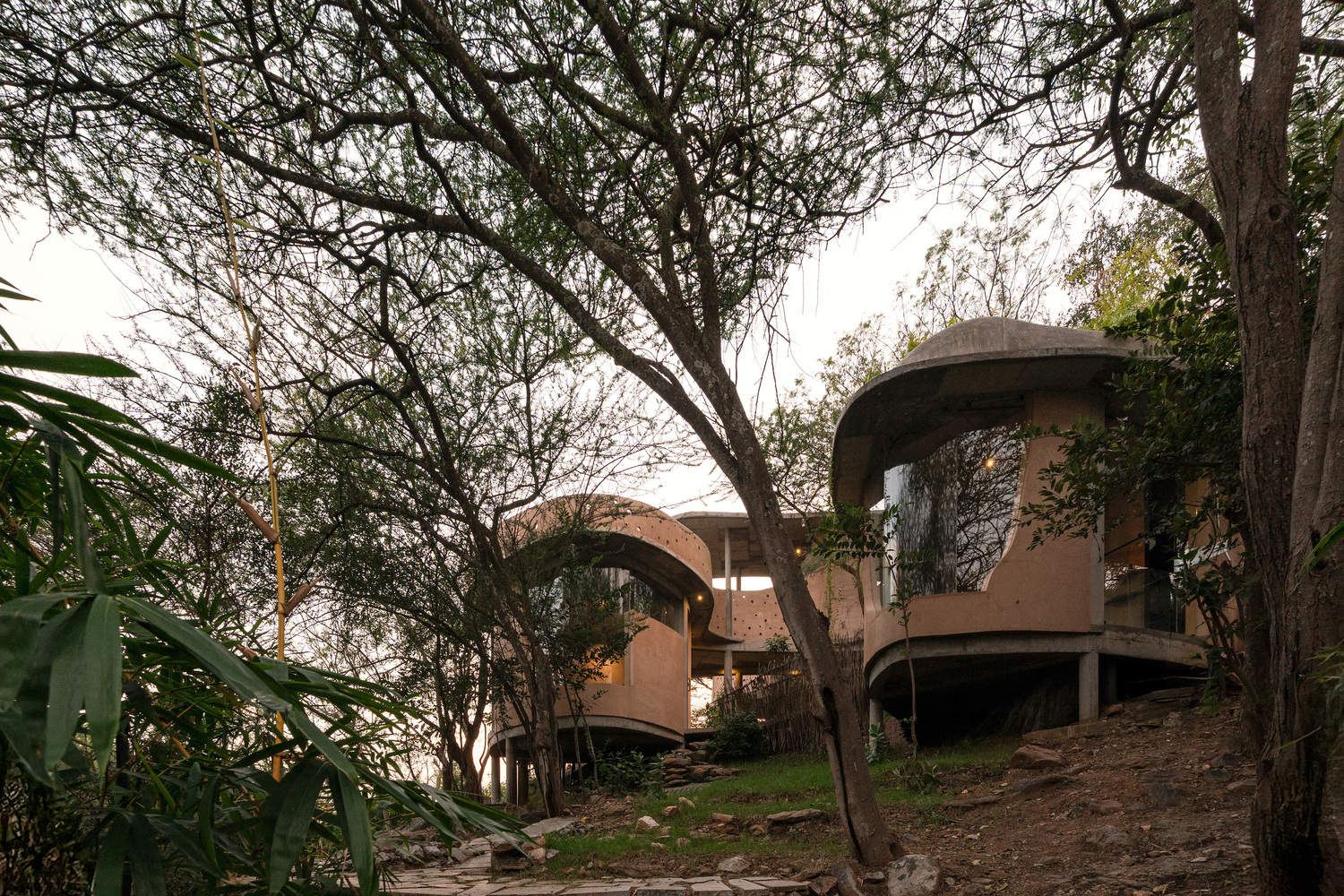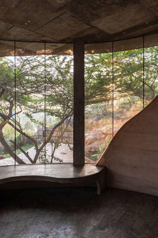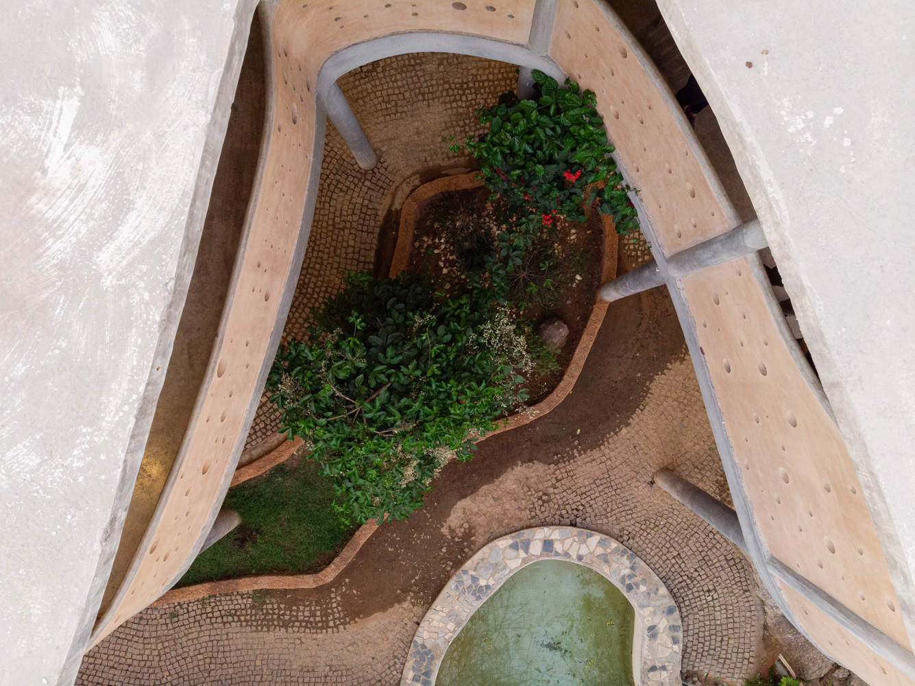 The walls, constructed from mud, evoke the earth's warmth in habitable spaces, while the service zones, such as toilets and staircases, are finished in gray tones that echo the tint of the natural rocks of the area. Sustainable building techniques bring this vision to life. Techniques like poured earth or raw earth concrete, which contain a small proportion of cement, have been used to create resilient walls with minimal ecological impact. To complement, lightweight materials like ferrocement have also been used.