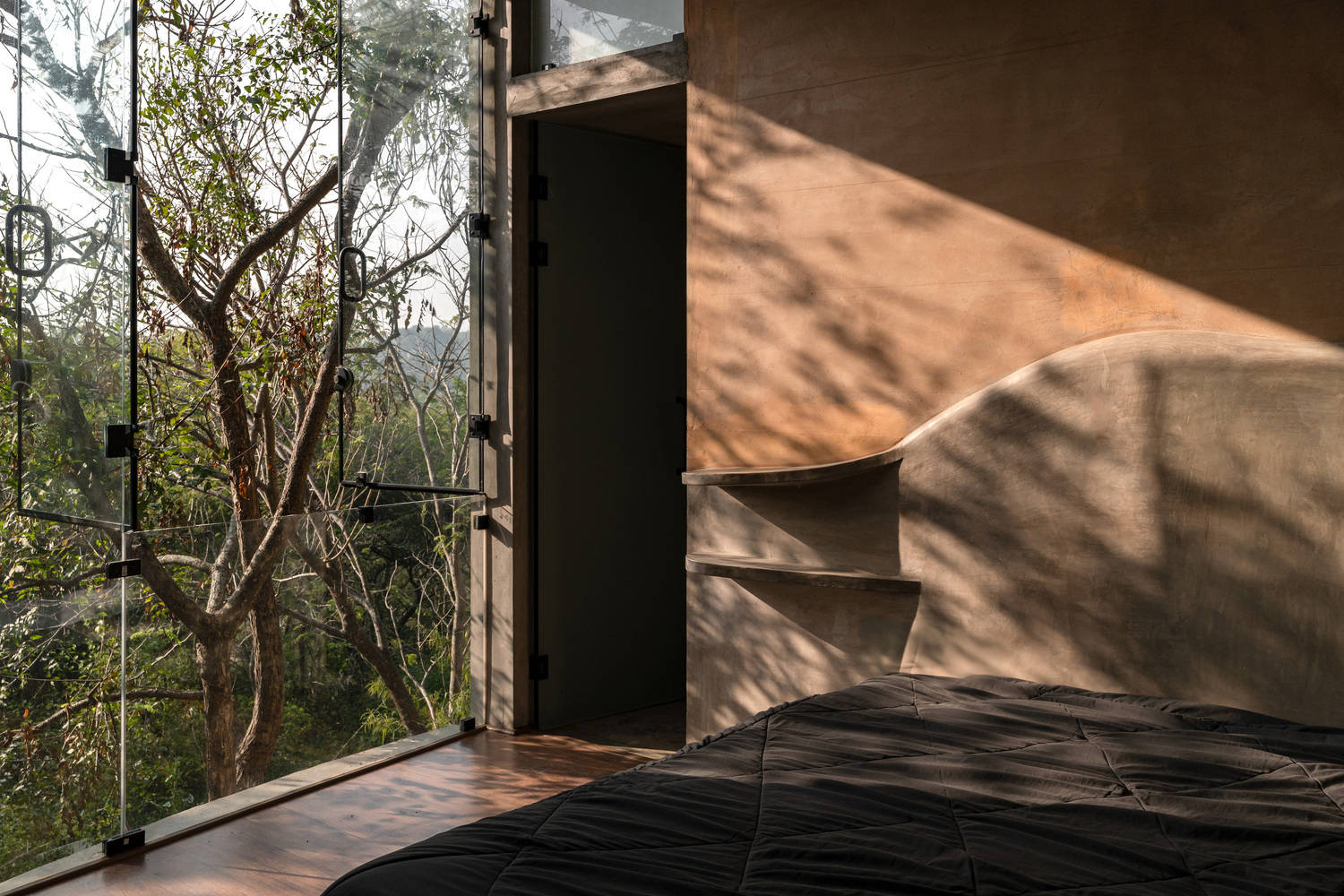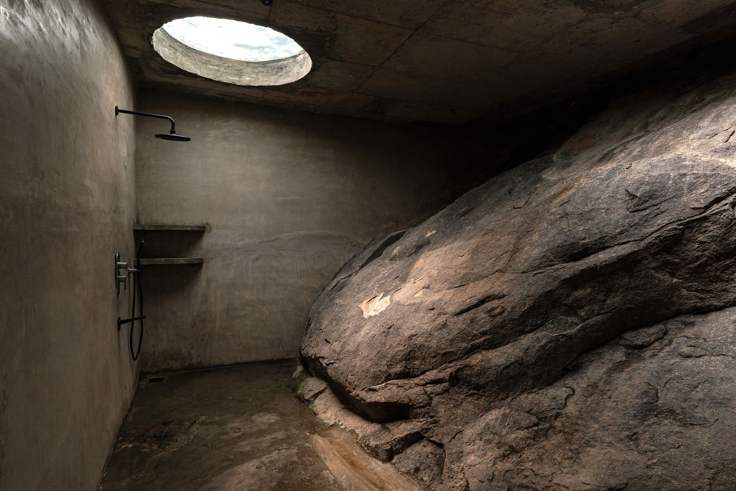The interiors of Winterfell emphasize minimalistic elegance, featuring built-in furniture such as beds, wardrobes, seating areas, and kitchen counters. Durable terrazzo flooring adds a clean finish, while the concrete roof slabs display unaltered shutter marks, preserving the material's raw beauty. This seamless blend of modern design and nature creates a living space that respects the land, elevates organic design, and embodies a holistic connection to its environment.