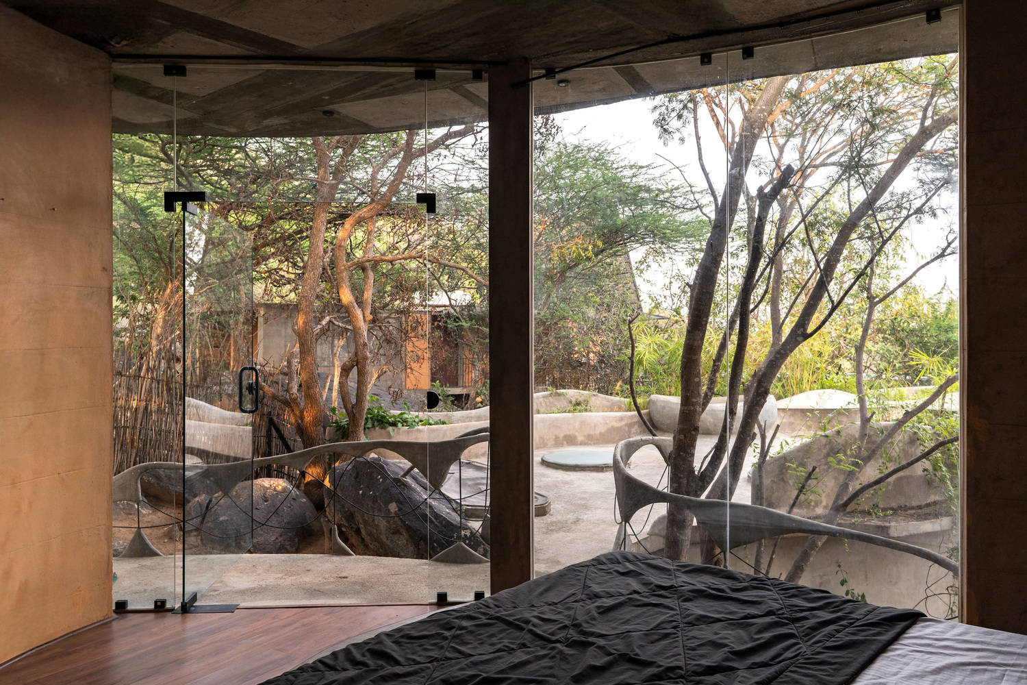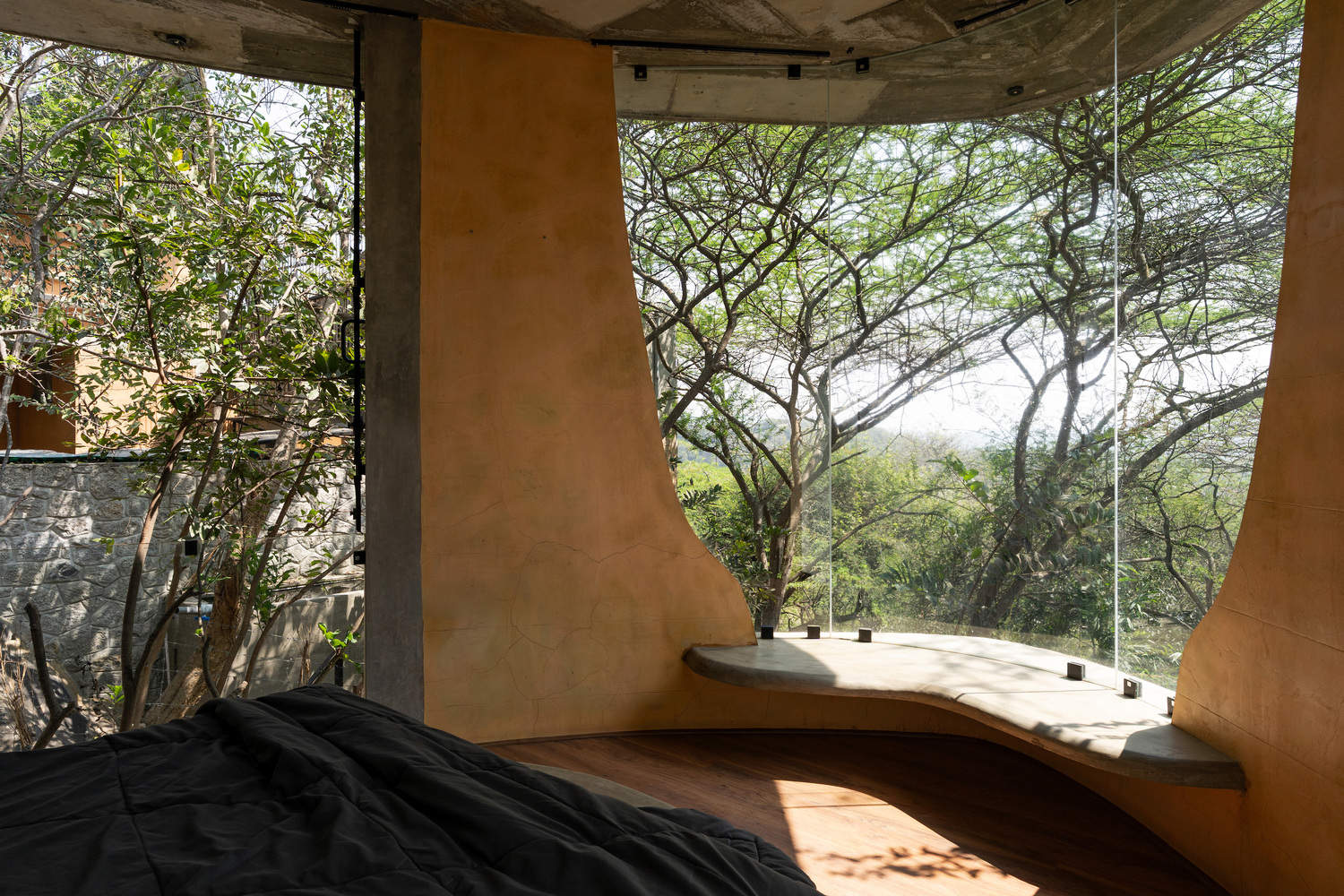 The natural rocks and abundant trees on the site inspire the building's organic form, seamlessly integrating the structure with its environment. The structure is elevated to preserve natural drainage and to ensure a minimal environmental footprint. Winterfell offers sweeping panoramic views through its seamless curved glass, mesh windows, open decks, and terraces, which extend outwards. At the North-east corner, existed a valley-like terrain, which was strategically converted into swimming pools with two levels, providing a safe and shallow area for children and a separate section for adults.