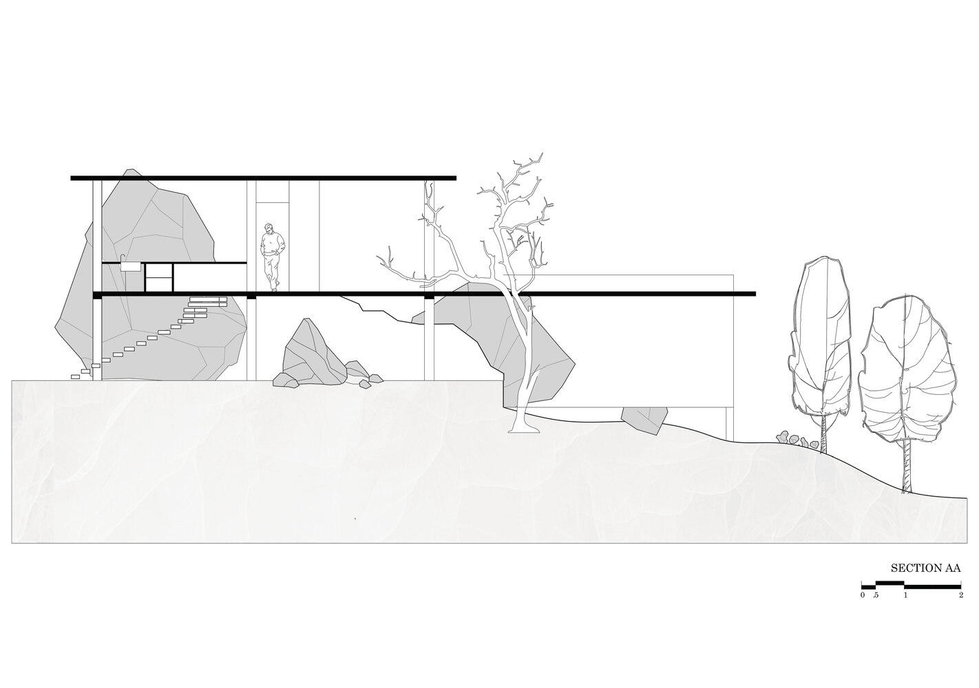 场地上的天然岩石和丰富的树木激发了建筑的有机形态,使结构与环境无缝融合。该建筑被抬高以保护自然排水并确保最小的环境足迹。临冬城通过其无缝弯曲的玻璃、网状窗户、开放式甲板和向外延伸的露台提供了全景。在东北角,有一个山谷般的地形,它被战略性地改造成两层游泳池,为儿童提供了一个安全而浅的区域,并为成人提供了单独的区域。