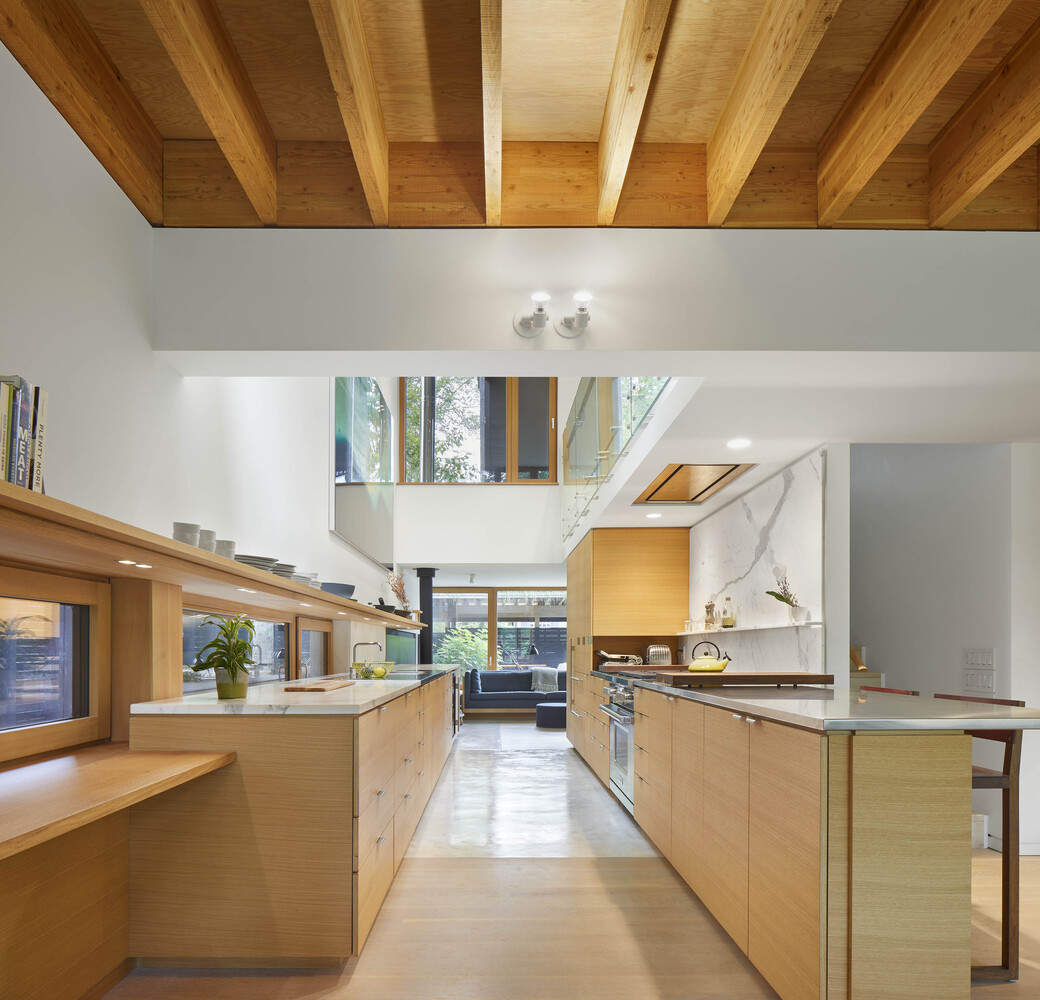 The linear kitchen is a double-height volume inviting generous light and atypical connections to more private spaces on the second floor. This organic gesture naturally draws light and views into the interior. The dining area, facing south, fluidly connects the kitchen with the living area. To the north, an anterior den is arranged around a woodstove, providing a casual point of connection for family and friends, and visually engaging the kitchen with the entry courtyard.
