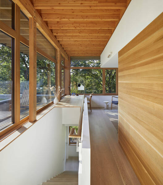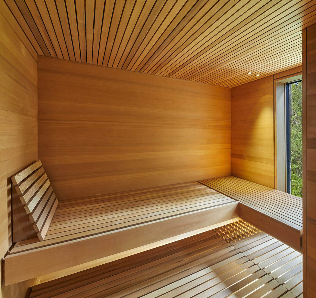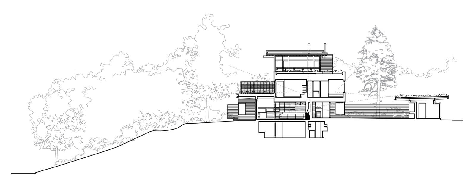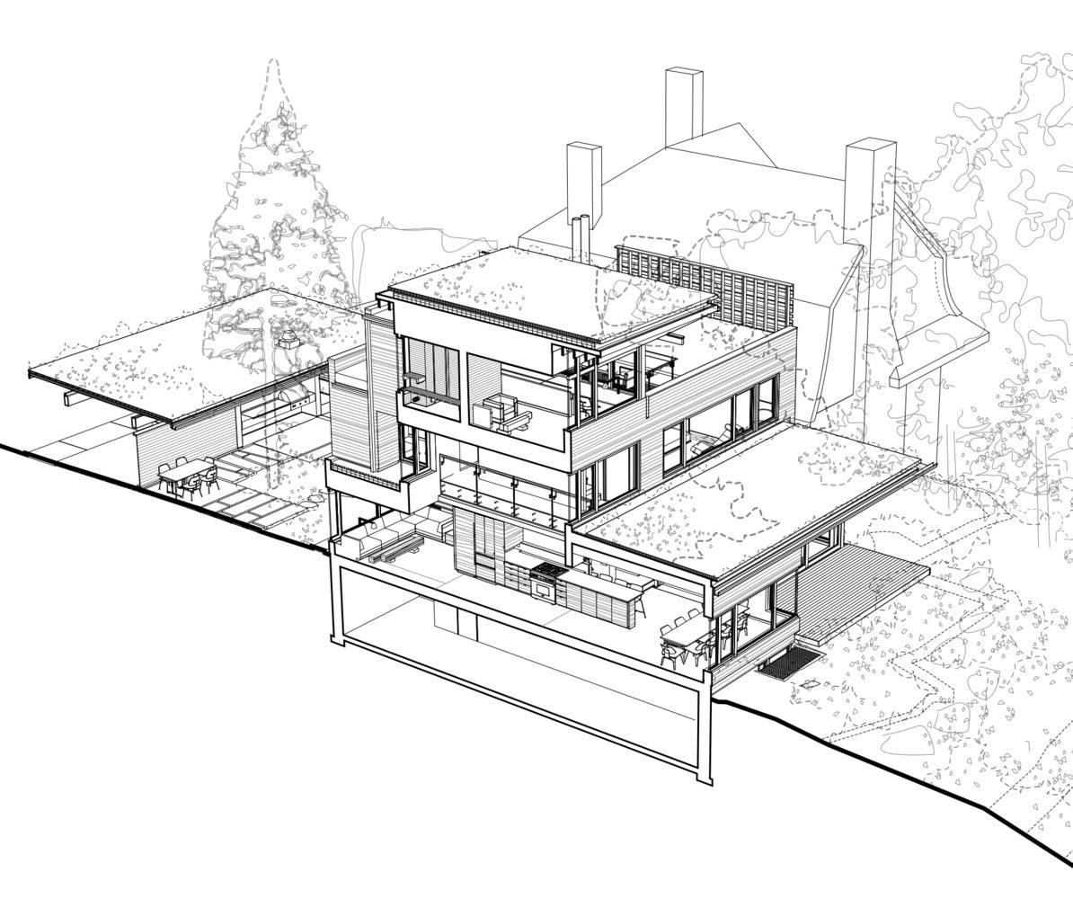 On the second floor, view frames from the bedrooms and bathrooms edit out the middle-ground landscape of the lane and road so that the sense of engagement with nature is enhanced. The third floor is the parental sanctum place of repose, remote from the fray of the other activities in the house, providing a place to work, lounge, and enjoy the experience of sauna rounds in quiet repose. Views from here are framed by the cantilevered roof and the green roof landscaping to present an ideal realm for restoration embedded within the mature forest canopy of the ravine forest.
