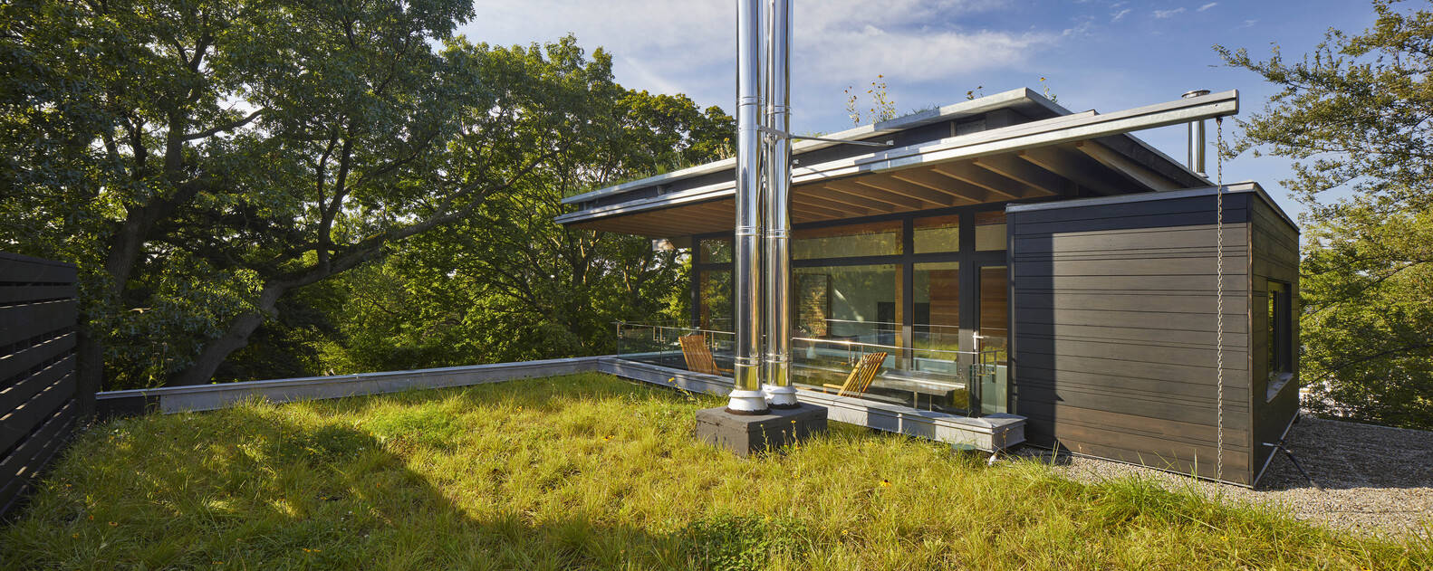Arrival to the residence from the rear laneway is signaled by one's passage through an oversized pivot door and under a floating green roof structure that at once accommodates carport, storage, and gateway functions. This sequence creates a level of anticipation that is rewarded by one's arrival into the contained private courtyard. This space serves as an entry court, a quiet place of repose for reading and dining in the garden, and as a private view prospect from the house. Its containment creates a level of privacy that allows it to serve as an outdoor room, complementing the natural view of the south ravine landscape experienced from the principal rooms.