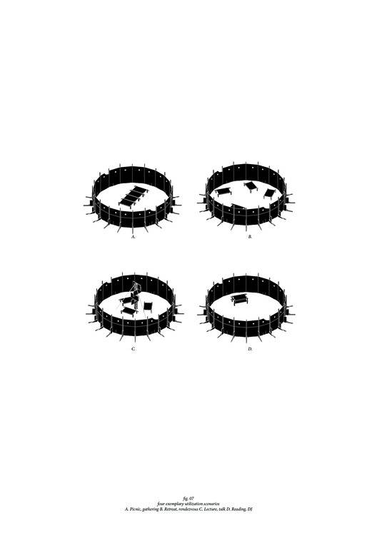 圆形展馆展示了建筑如何在公共空间中定位,从而为所有公民提供了参与、交流和交换想法的机会。开放的圆形空间旨在服务于各种使用场景。它的直径为8米,最多可容纳30人。对于BDA Wechselgespräch,在圆圈的中间立了一根柱子,柱子上安装了必要的技术。这根柱子象征性地放置在圆圈的中心——一个技术图腾,游客和演讲者可以聚集在这里。虽然这些小平台在讲座期间用作演讲者的座位,但它们可以被安排成一张大桌子用于其他用途,比如野餐或绕圈表演。舞台元素也可以堆叠起来,形成一个用于阅读的讲台。圆圈的空间和视觉边界也创造了一个宁静的地方,免受窥探。因此,这个圆圈既是撤退的地方,也是聚会的地方。