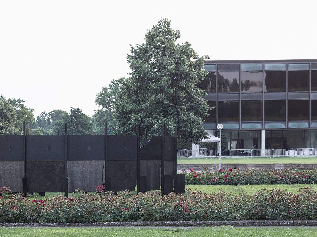 为了与宫殿建筑群的对称布局保持一致,亭子被放置在新宫前的中心,呈基本几何形状——圆形。为了抵消学院花园的宽敞,并为预期用途创造适当的氛围,设计了一个向上开放的空间,隐藏了行人楼层,从而可以从新的角度体验公园和新宫。为了使展馆在巨大的宫殿建筑群前散发出某种存在感,人们试图用少数组件创造尽可能大的空间。