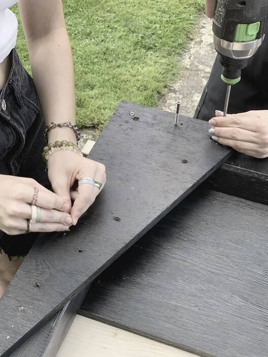 Both the construction and dismantling of the individual components had to be taken into account at the planning stage. The junctions were planned to be easily accessible, inspectable and removable. To ensure this, all connection points were produced using screw connections. The construction was carried out at various levels using simple pincer connections and wooden nail plates."Wet connections" such as gluing or grouting were avoided in the interests of circularity. The anchoring in the ground was micro-invasive using ground nails or ground screws, which were attached with ropes to the base points of the rafters or uprights.