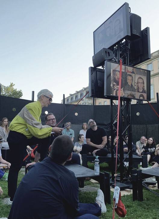 The circular pavilion shows how architecture can be positioned in the public space and thus offers all citizens the opportunity to participate, communicate and exchange ideas. The open, circular space is intended to serve various usage scenarios. With a diameter of eight meters, it offers space for up to 30 people. For the BDA Wechselgespräch, a pillar was erected in the middle of the circle to which the necessary technology was attached. This column was symbolically placed in the center of the circle - a totem for technology where visitors and speakers can gather around. While the small platforms served as seating for the speakers during lectures, they can be arranged into a large table for other uses - such as a picnic or a performance in a circle. The stage elements can also be stacked to create a Podium for readings. The spatial and visual boundaries of the circle also create a place of peace and quiet, protected from prying eyes. The circle is thus both a place of retreat and a meeting place.