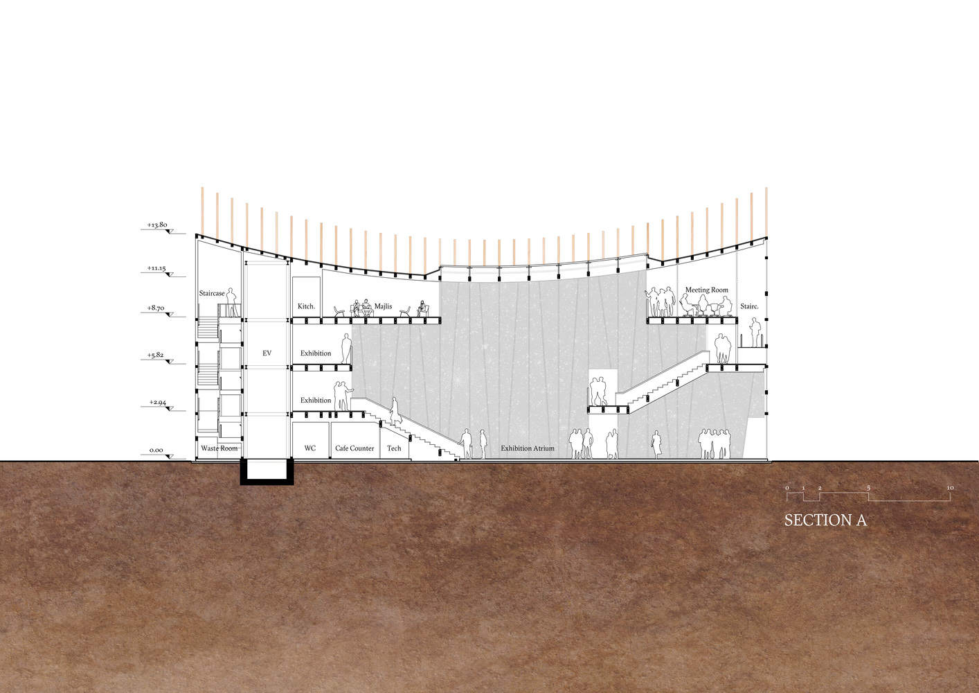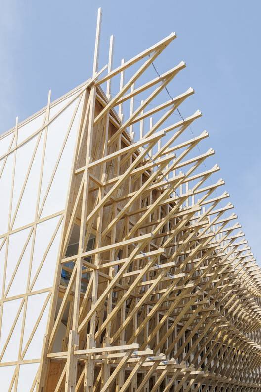 Situated in the "Empowering Lives" zone, the pavilion spans 995 square meters and Rises from 13 to 17 meters in height across four levels, overlooking the seafront. Designed by Lebanese architect Lina Ghotmeh, the structure is made from wood and cooled by coastal winds, making it one of the most sustainable buildings in the Expo. "The Bahrain Pavilion embodies sustainability, cultural exchange, and craftsmanship. Built from around 3,000 pieces of un-engineered wood using intricate joinery, it minimizes waste," says Ghotmeh, "Minimal foundations avoid concrete, nearly all materials are reusable, and passive cooling reduces energy use—making it a testament to sustainable innovation."