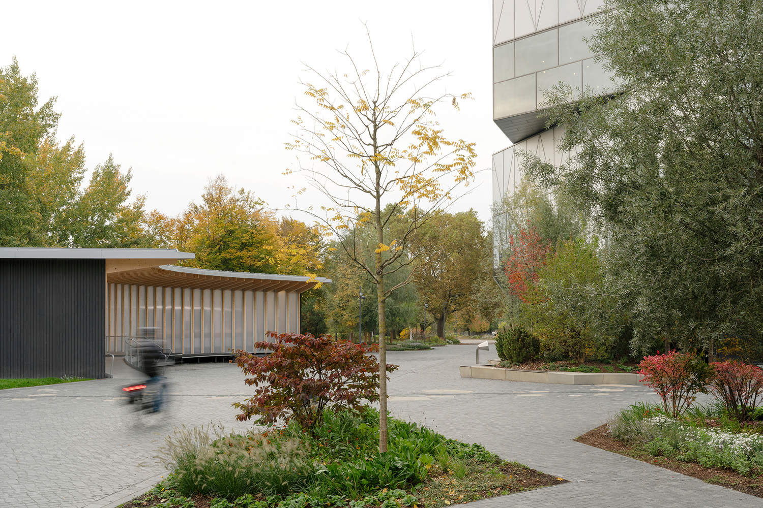 The Experimenta square on Heilbronn's Kraneninsel, which is already urbanistically defined by the Hagenbucher warehouse, the striking extension building and the banks of the Neckar, is now completed on the west side by the curved façade of the AI Pavilion. With a light canopy, under which stepped platforms invite you to linger or discuss, the building acts as a kind of modern 'stoa' within this 'knowledge forum'.