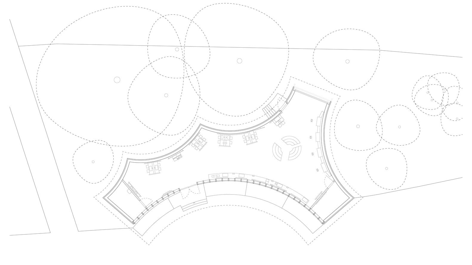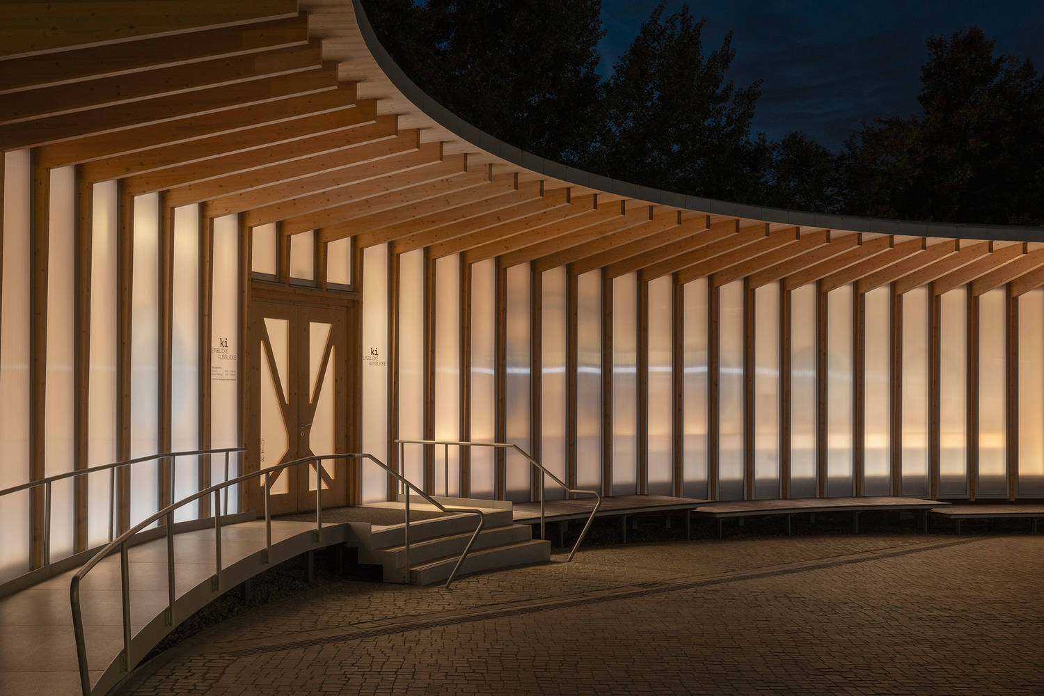 The lightweight, element-based wooden construction was completely prefabricated. The floor slab, ceiling, and the curved wall elements are made of cross-laminated timber, the serial T-supports are made of glued laminated timber. The facade made of identical polycarbonate lightweight panels illustrates the temporary character of the pavilion. All connections of all elements can be undone and reassembled. This makes it possible to replace individual parts or even flexibly erect and reuse them at different locations. The renewable building material wood binds CO2 in the long term, the use of lightweight materials as well as prefabrication and elementisation, leads to efficient use of materials and facilitates the recyclability of the components. The conscious use of ageing materials and the acceptance of natural decay point to a new aesthetic of sustainability.