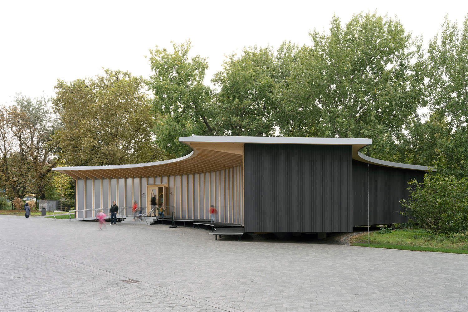 轻质、基于元素的木结构完全预制。楼板、天花板和弯曲墙元件由交叉层压木材制成,系列T形支架由胶合层压木材制成。由相同的聚碳酸酯轻质面板制成的立面展示了展馆的临时性特征。所有元件的所有连接都可以拆卸和重新组装。这使得可以更换单个零件,甚至可以灵活地安装并在不同位置重复使用它们。可再生建筑材料木材长期吸收二氧化碳,使用轻质材料以及预制和元素化,可有效利用材料并促进组件的可回收性。有意识地使用老化材料和接受自然腐烂,表明了一种新的可持续性美学。