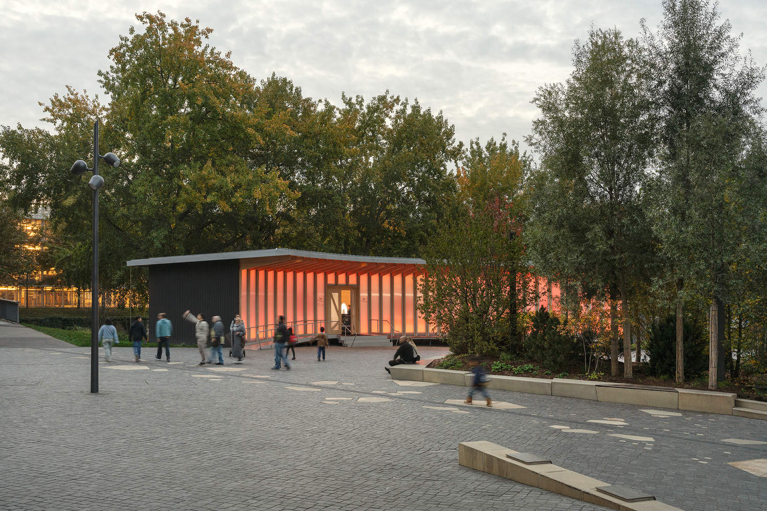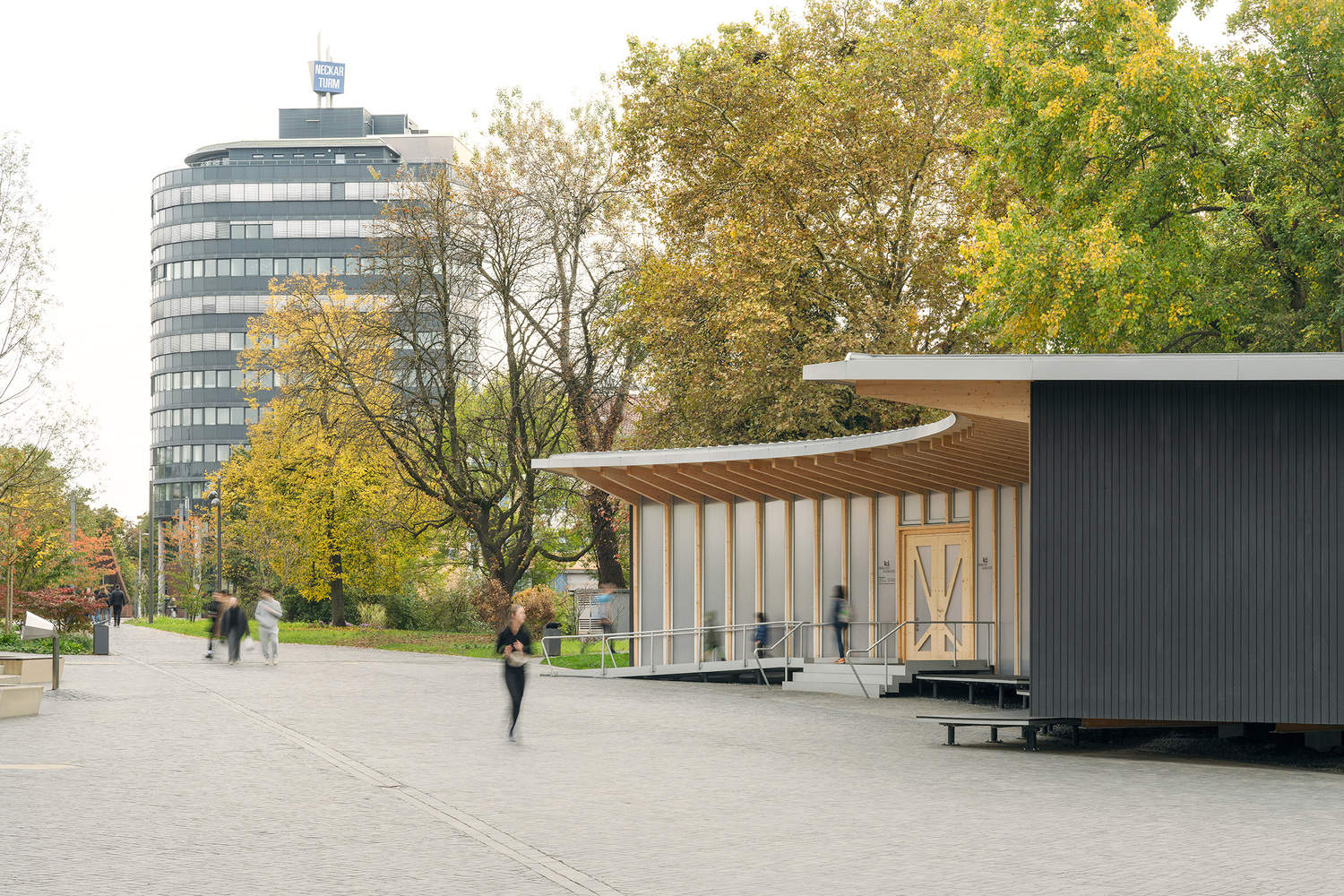 The building gets its characteristic shape from a sequence of concave outer walls that react to the crowns of the surrounding trees. Inside, these circular segments structure the exhibition, which is gradually revealed to visitors as they move through the space. The curved, translucent entrance facade brings gentle daylight into the exhibition and lets the interior shine out at night. On the side facing away from the square, a panoramic window opens between the wall elements and stages the view over the Neckar Canal. Passers-by can enter into a dialogue with the AI and its surroundings through an interactive light installation on the facade.