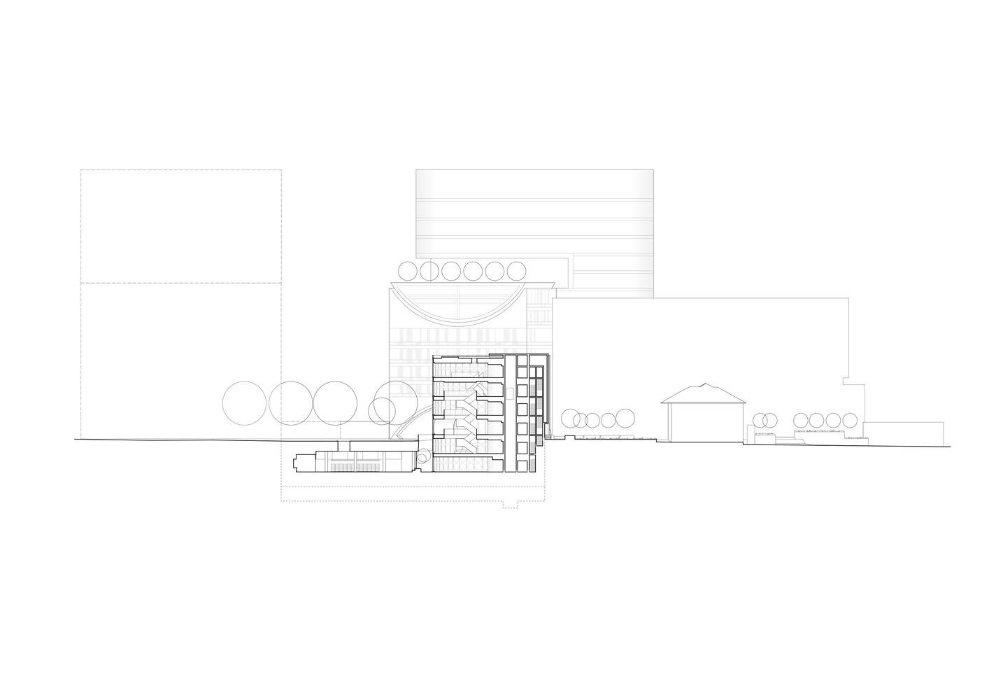 创新的空间布局与可持续设计:项目的另一个亮点是其创新的空间布局和对可持续设计的关注。建筑师巧妙地利用曲线造型,创造了与周边环境和谐融合的建筑形态,激发了行人的流动性。同时,通过落地窗设计,增强了室内外的视觉联系,营造出开放和欢迎的氛围。图书馆内部,通过庭院、天窗、阳光的引入,以及对不同功能空间的合理划分,实现了采光最大化和空间利用效率。此外,可持续设计的理念贯穿始终,这体现在材料选择、能源利用和环境友好性等方面,彰显了对环境的尊重和对未来负责任的态度。