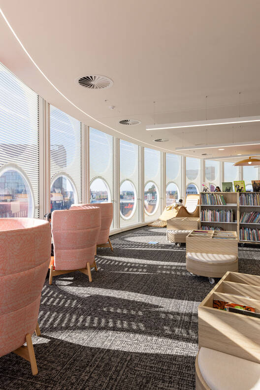 Entry lies within the pedestrian-friendly open space, away from noise and traffic. The human-scaled floor levels above and below the entry are awash with daylight and offer easily accessed collections, seating and study areas. Highly valued as the positive future for so many in the community, young people are raised to the top of the building, a place of great quality and safety, where youth and children are offered their own domain. Youth areas support group study and socialisation. The wonderful outlook on the children's level is celebrated with very popular 'king of the castle' tree-house lounges.
